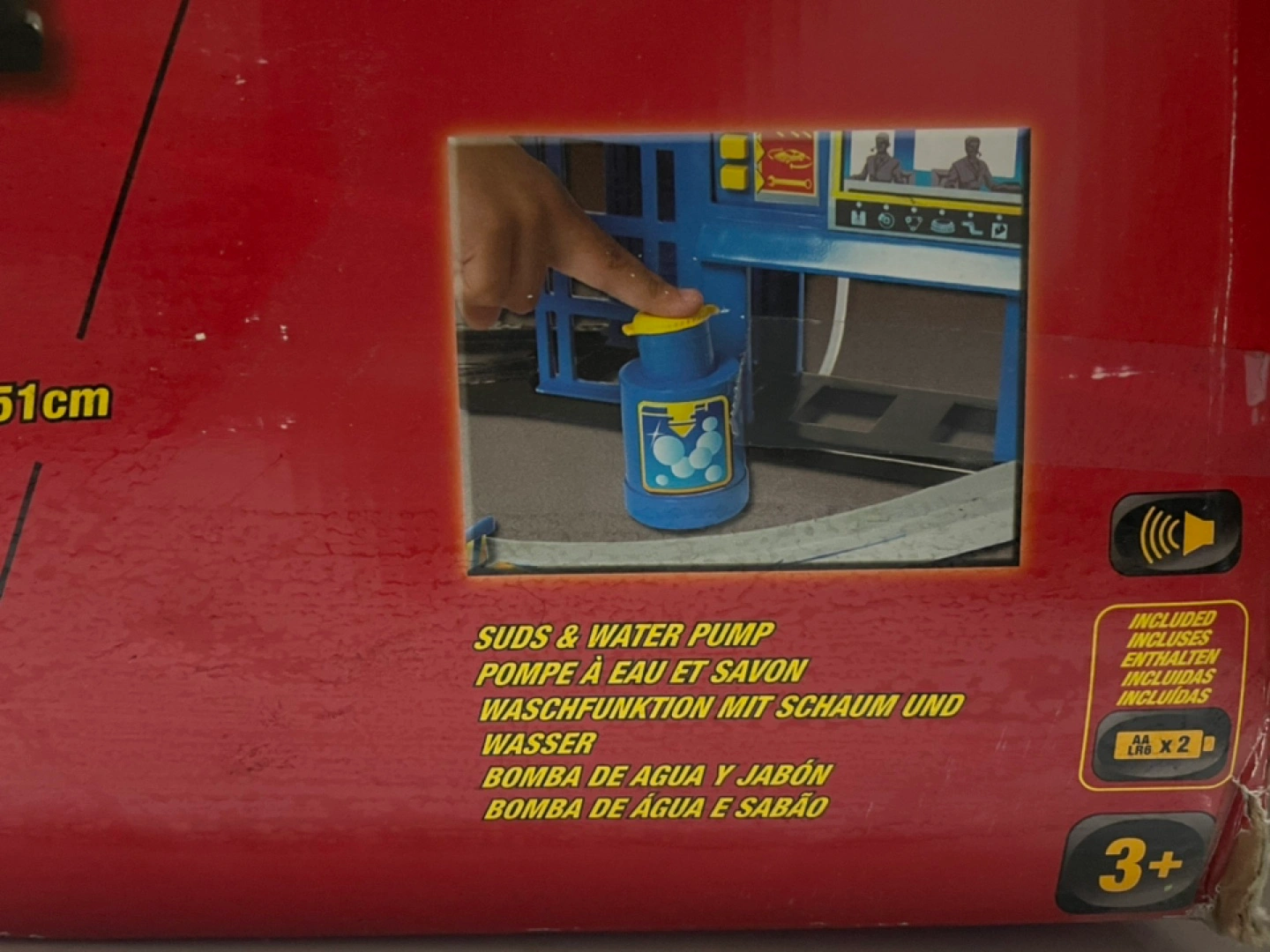 Playset includes car wash station, suds and water pump. Requires 2 AA batteries (not included). Recommended for ages 3+. Measures approximately 40cm x 51cm.
