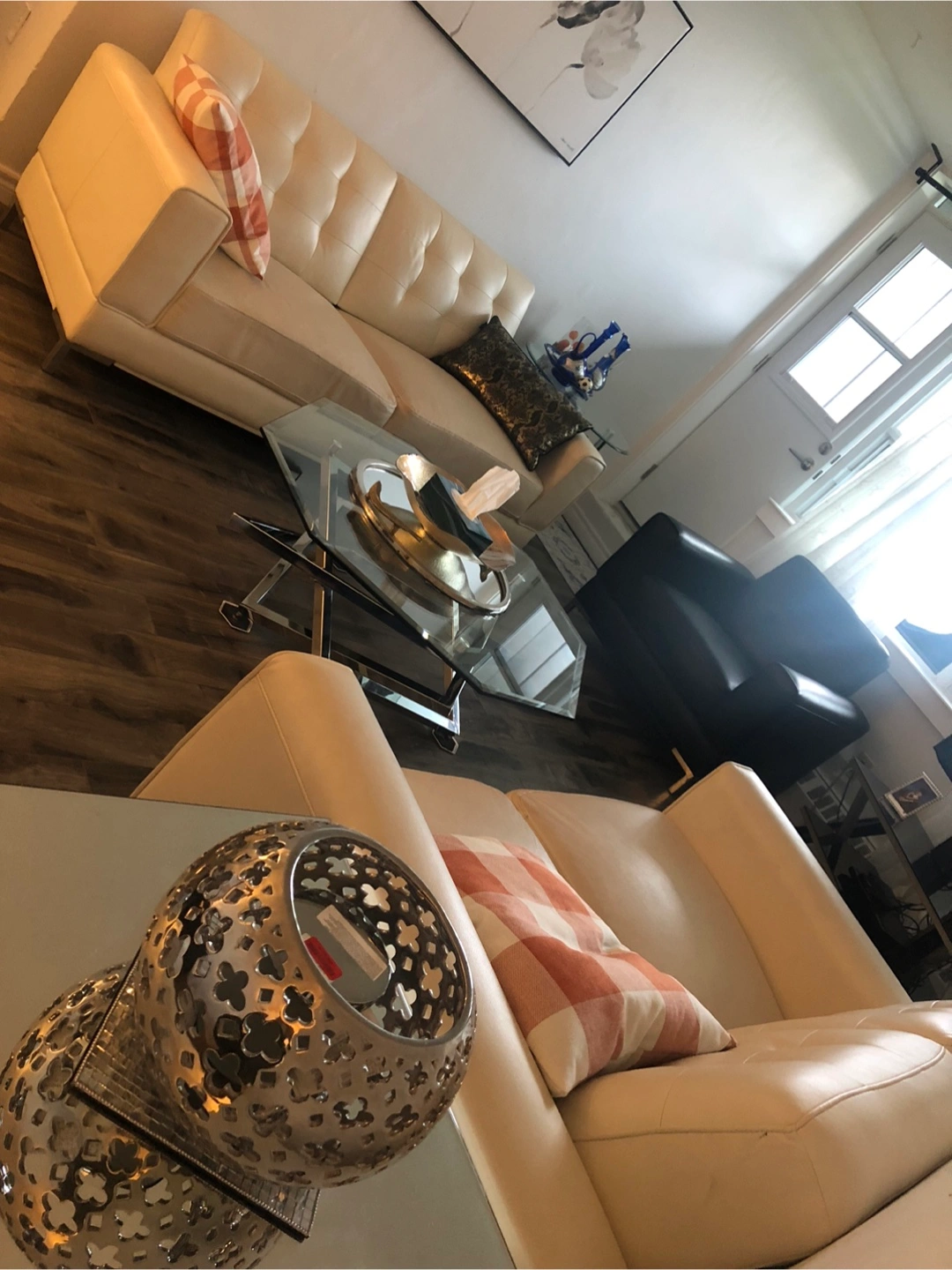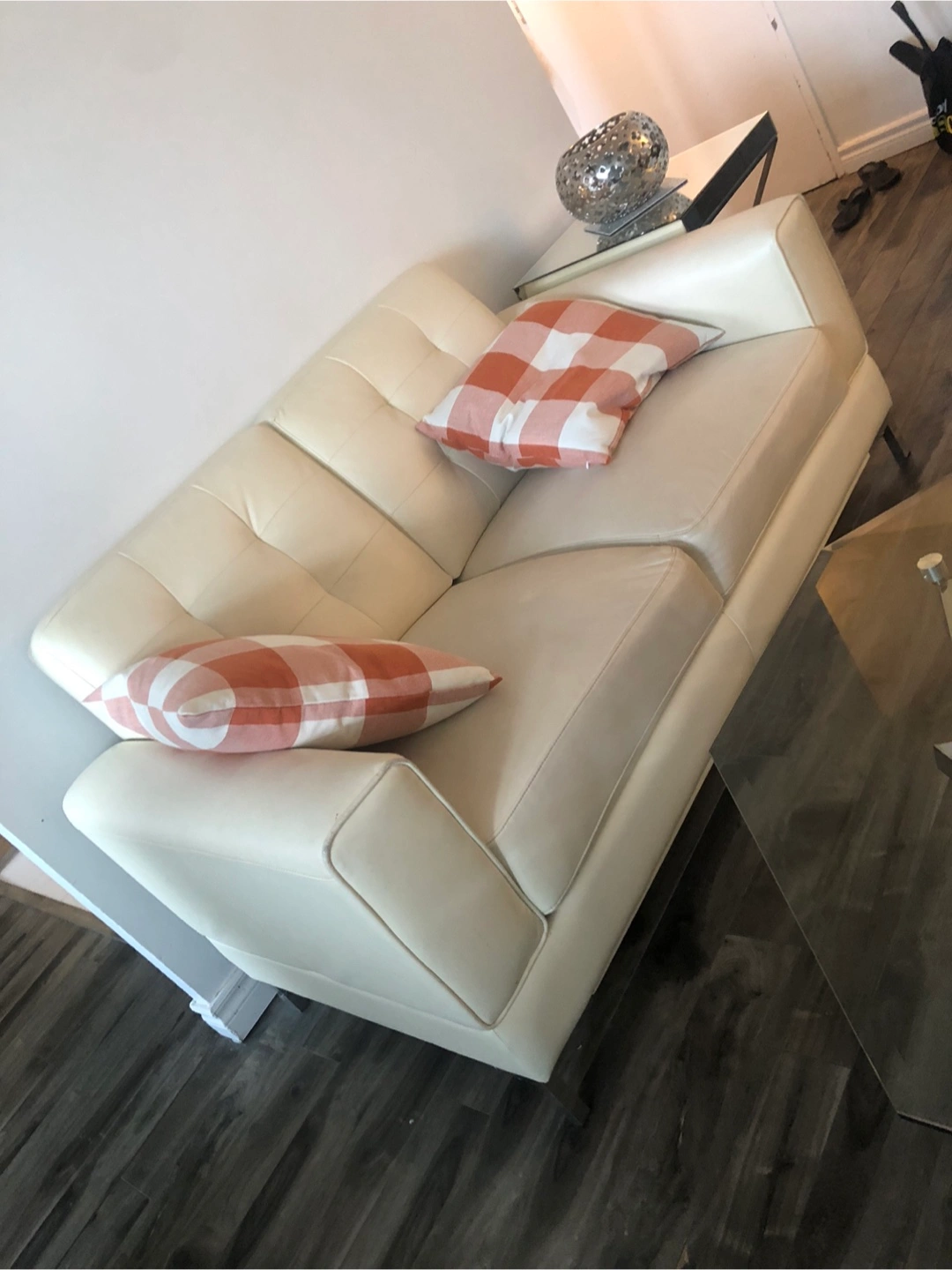 Two-seater off-white leather sofa. Modern design. Some minor wear and tear.sofa and love seat