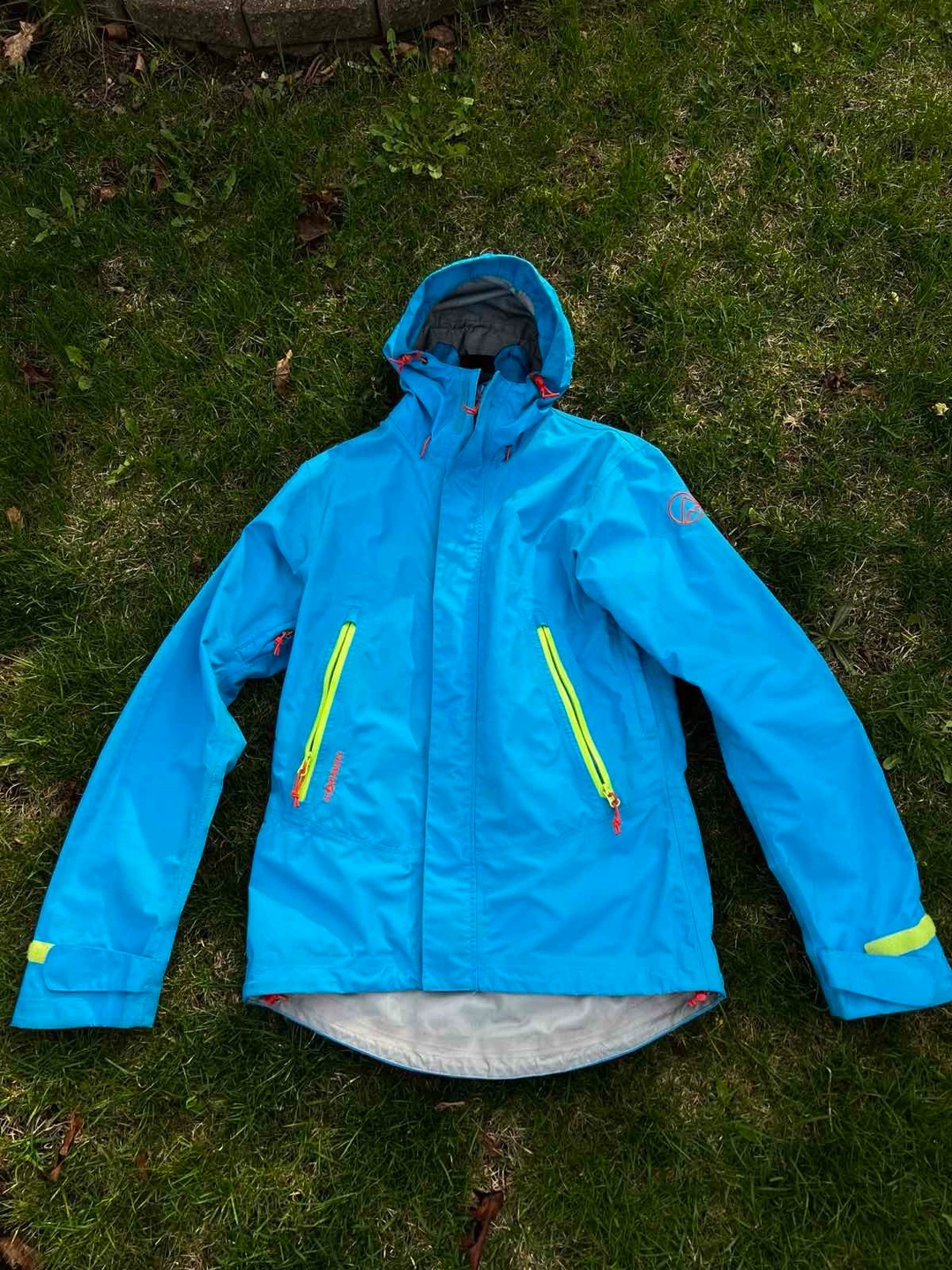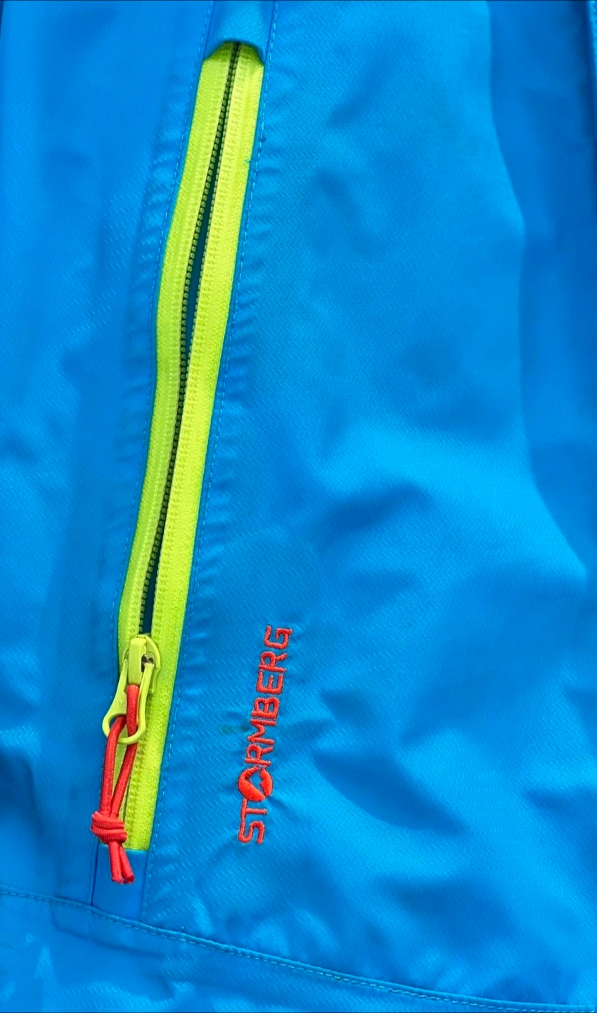 Goretex lightweight waterproof jacket. Bright blue colour. Features a hood and zippered pockets. Great for outdoor activities.