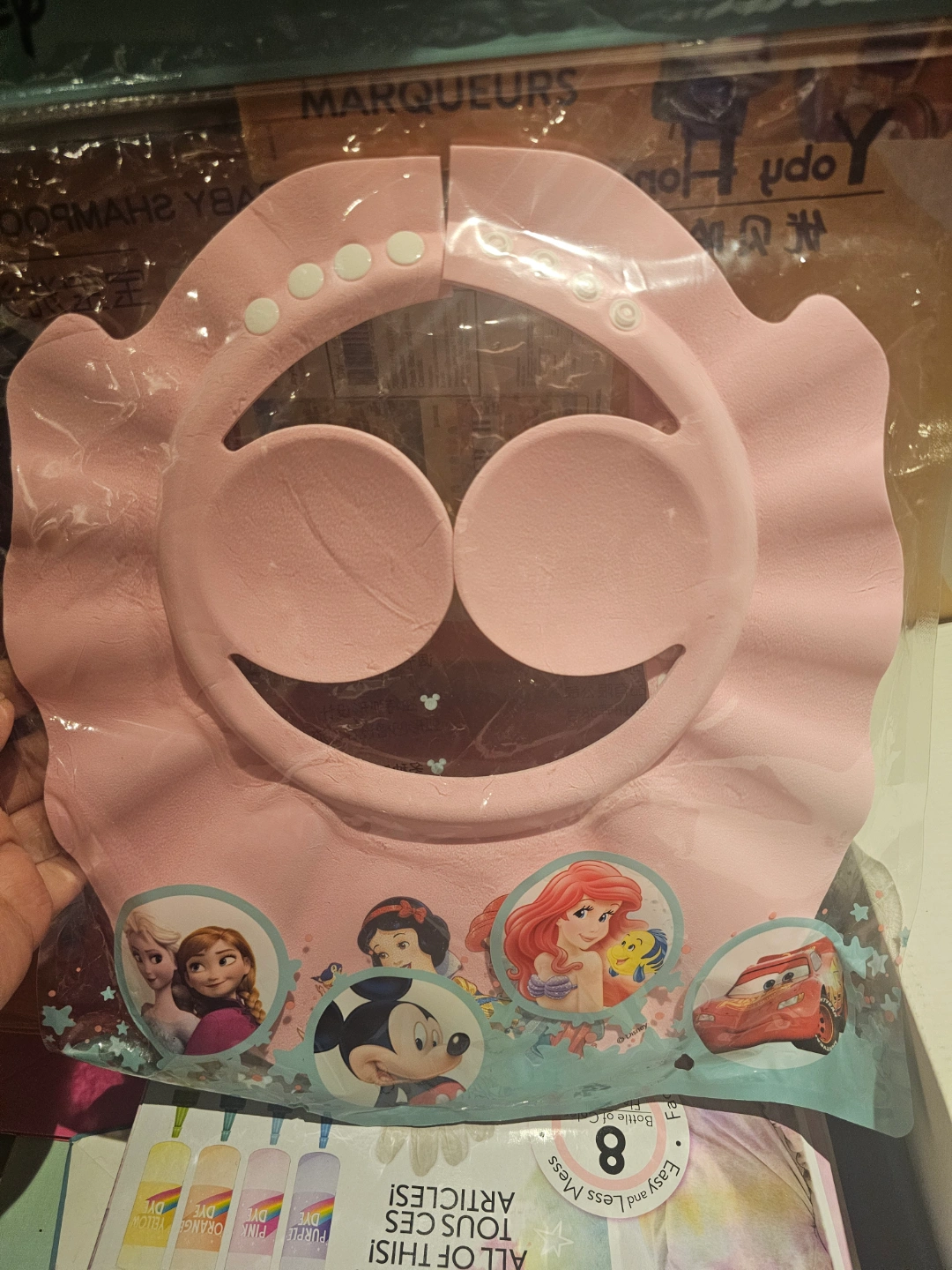 Pink silicone shower cap. Features various Disney characters including Mickey Mouse, Ariel, and Frozen's Elsa and Anna. Designed to keep water out of a child's eyes during shampooing. Easy to use and prevents mess.