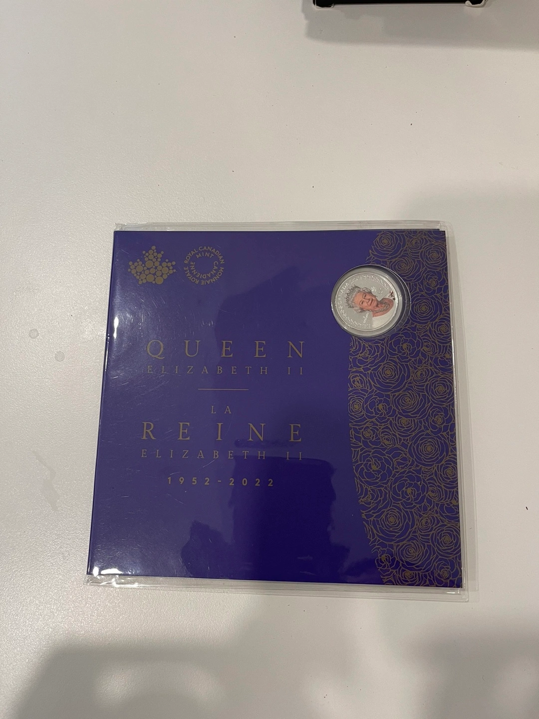 Royal Canadian Mint commemorative coin card. Features a portrait of Queen Elizabeth II. Includes a silver coin. Mint packaging.