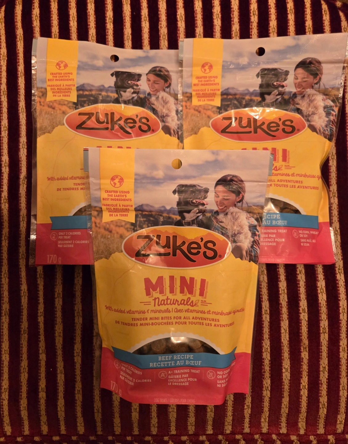 Three 170g bags of Zuke's Mini Naturals Beef Recipe dog treats. Tender mini-bites for training. Only 2 calories per treat. No corn, wheat, or soy. 2026 expiry