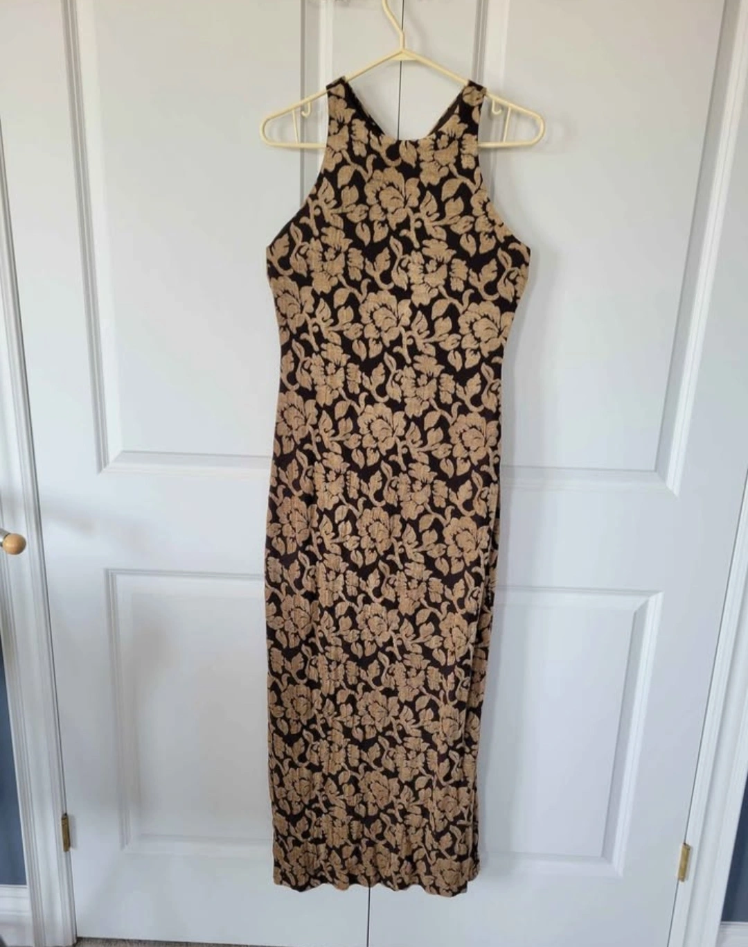 Beautiful long dress. Brown and gold floral pattern. High neckline. Cross back detail. Perfect for a special occasion. pick up near Fanshawe and Highbury