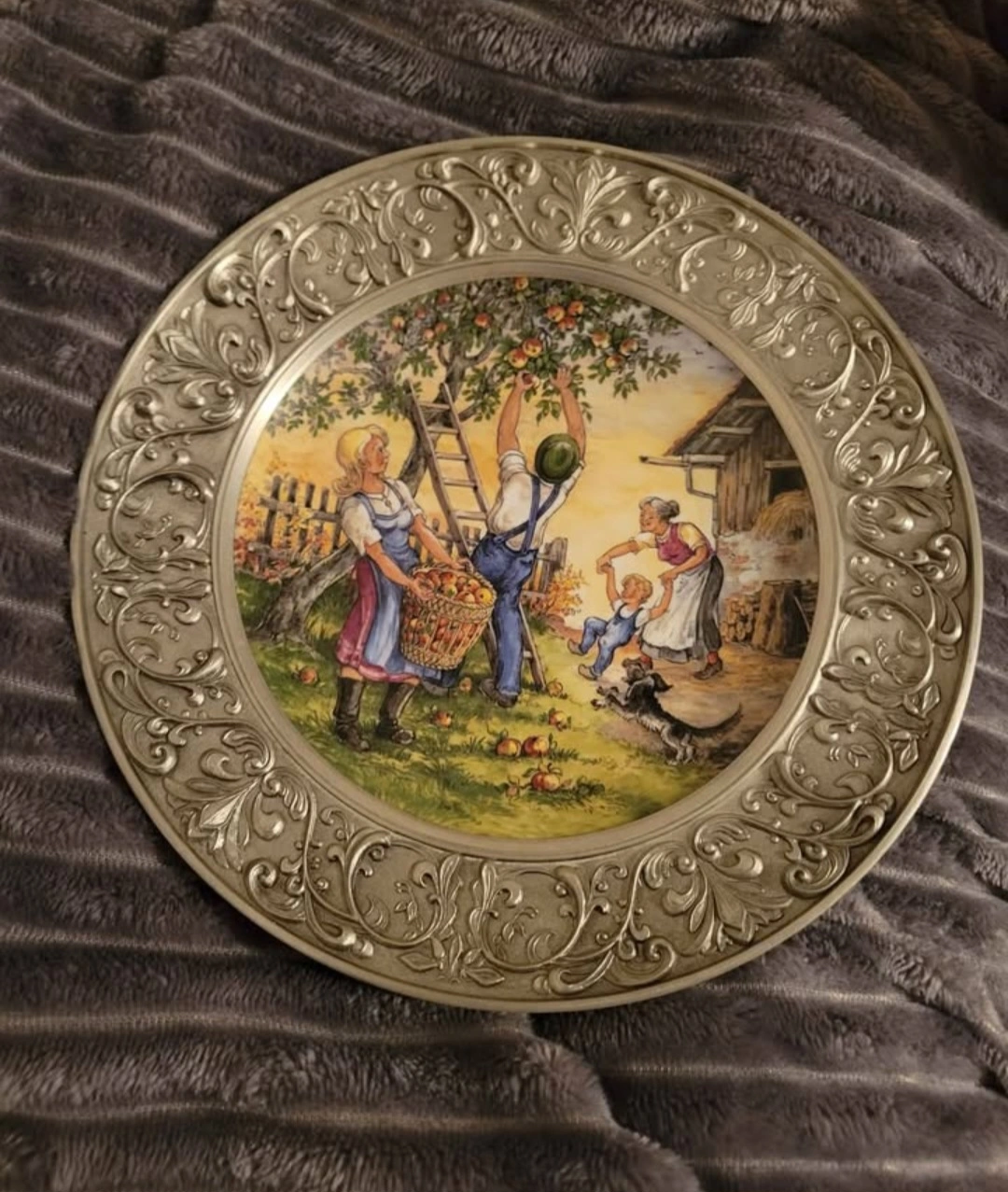 Beautiful vintage pewter wall plate. Features an idyllic apple harvest scene. Intricate detailing. Wall hanging hardware included. Measures approximately 10 inches in diameter. pick up near Fanshawe and Highbury