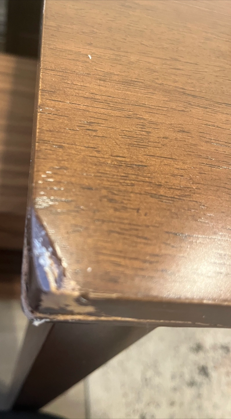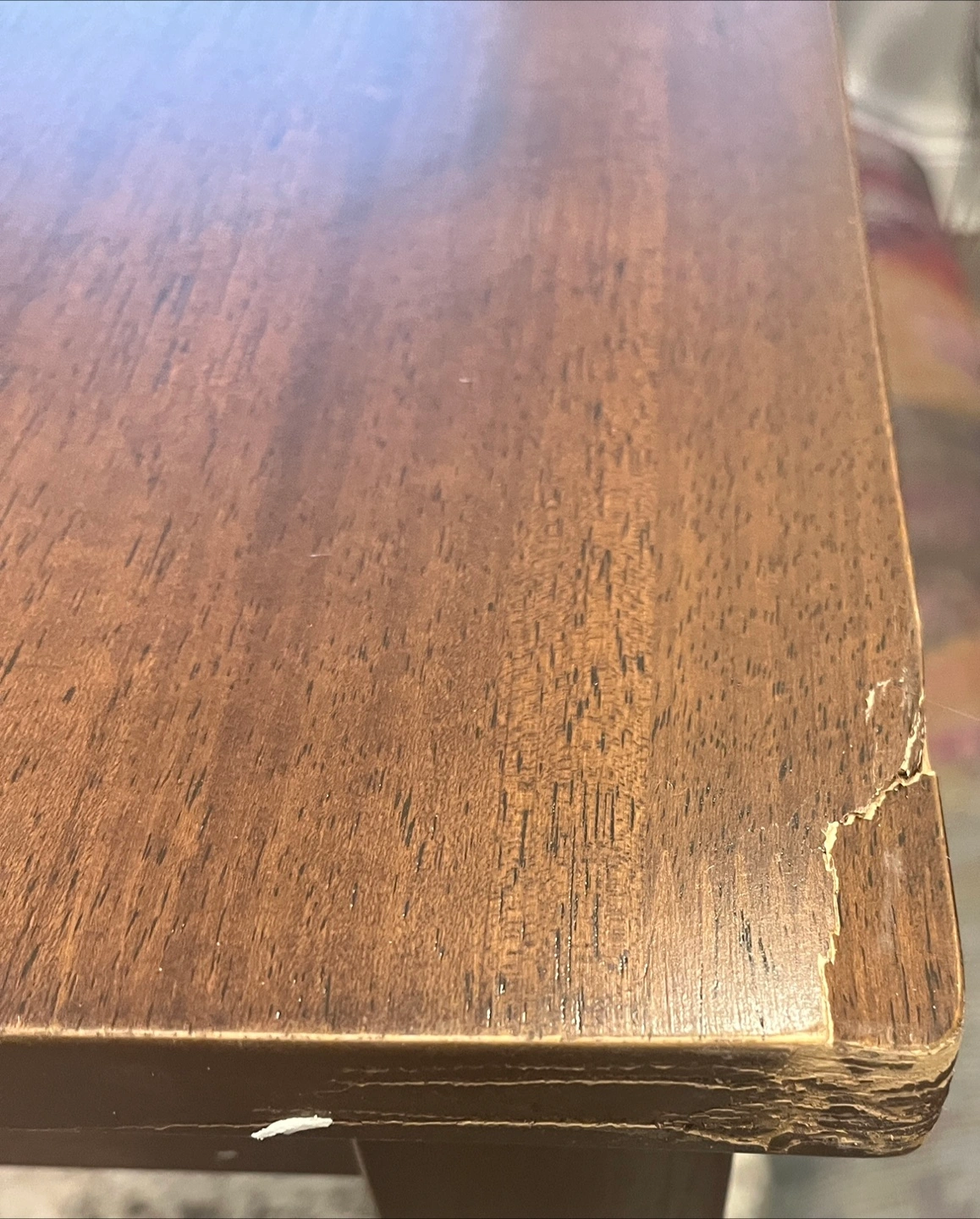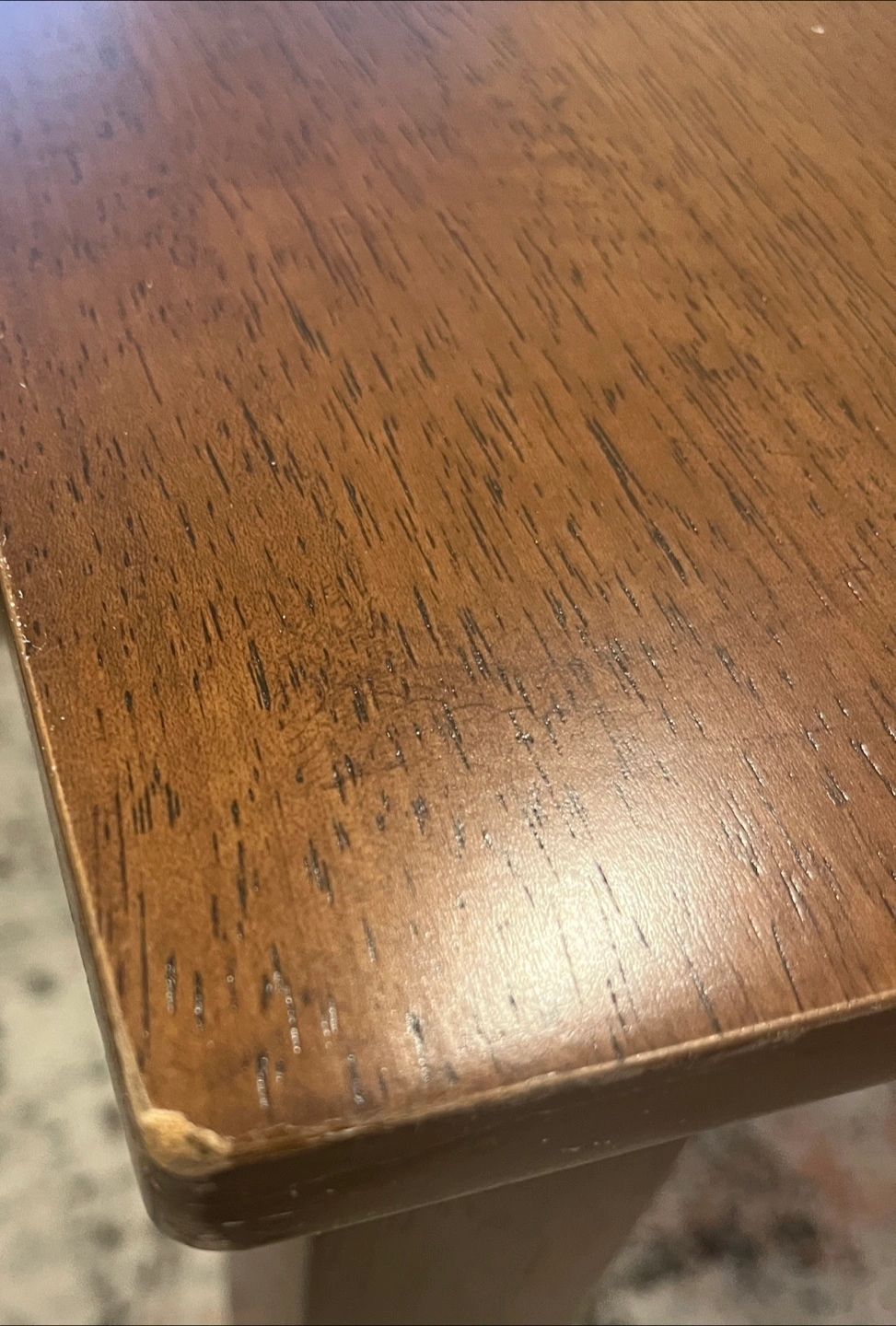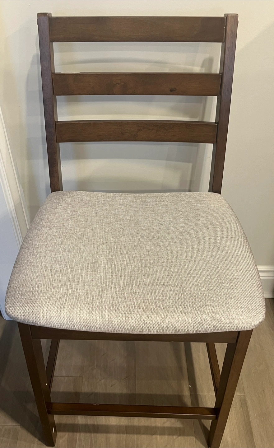 counter height dining set. Solid wood construction. Features a square table, Minor wear and tear. Damage on the corners