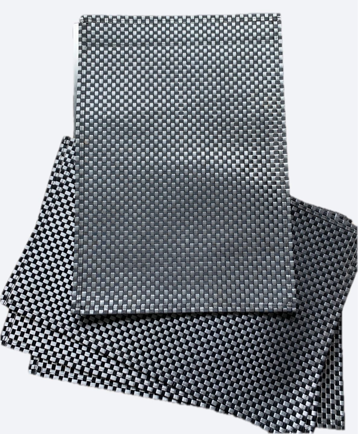 Stack of stylish placemats. Silver and black woven design. Durable material. Perfect for everyday use or special occasions.