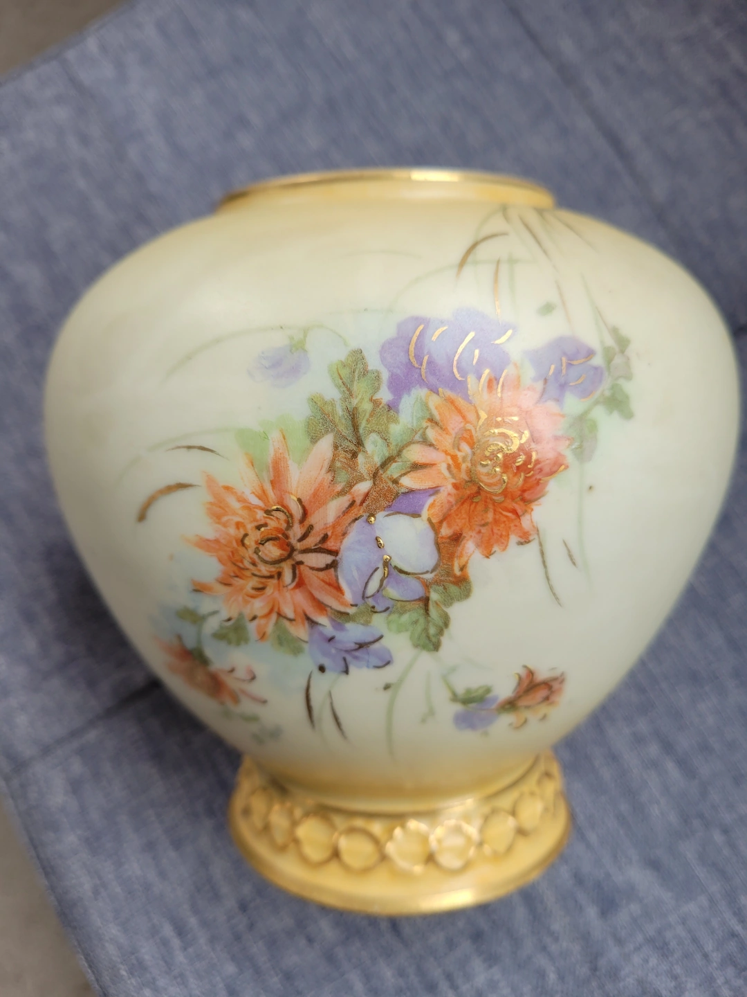 Lovely antique porcelain vase. Features a floral design. Pale yellow body with orange and purple flowers. Gold accents. Made in Austria. Numbered on the bottom. pick up near Fanshawe and Highbury