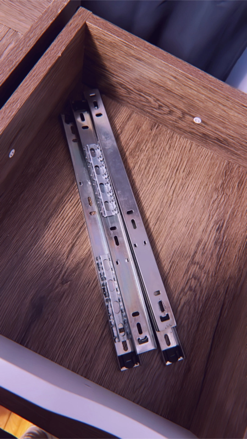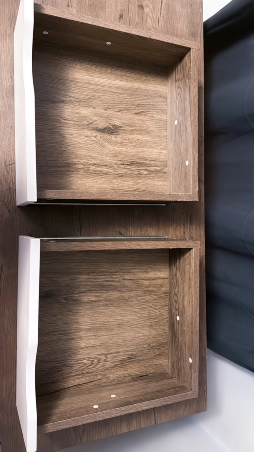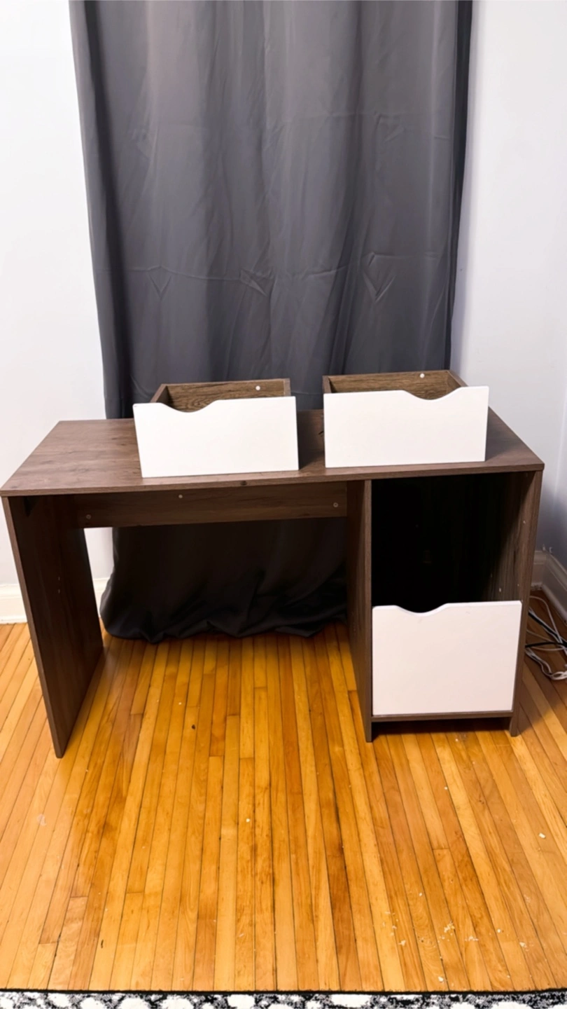 Stylish writing desk. Features three drawers, two smaller ones above a larger bottom drawer. Dark brown woodgrain finish with white drawer fronts. Assembly required.