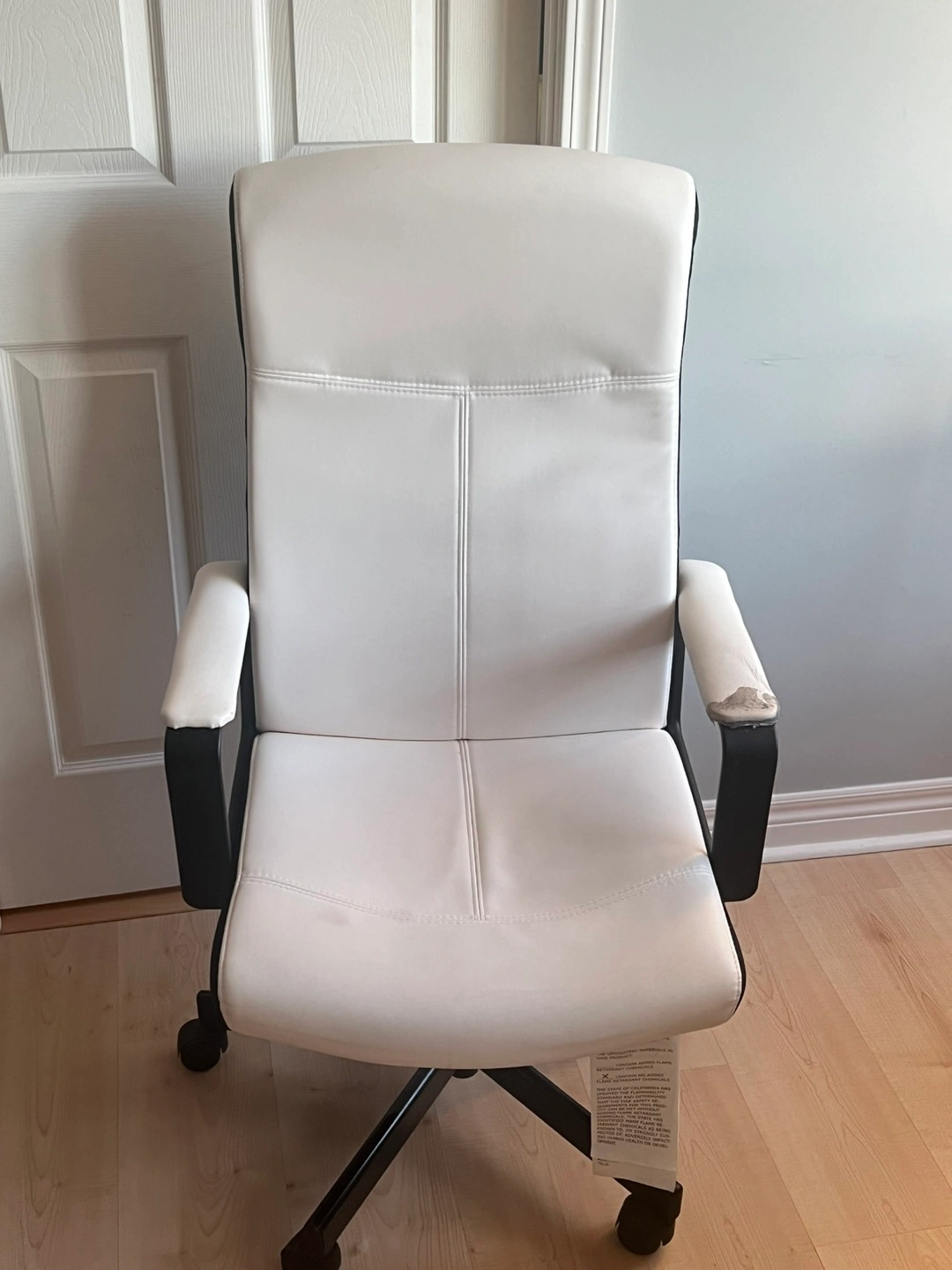 White office chair with black arms and base. Swivels and rolls on casters.