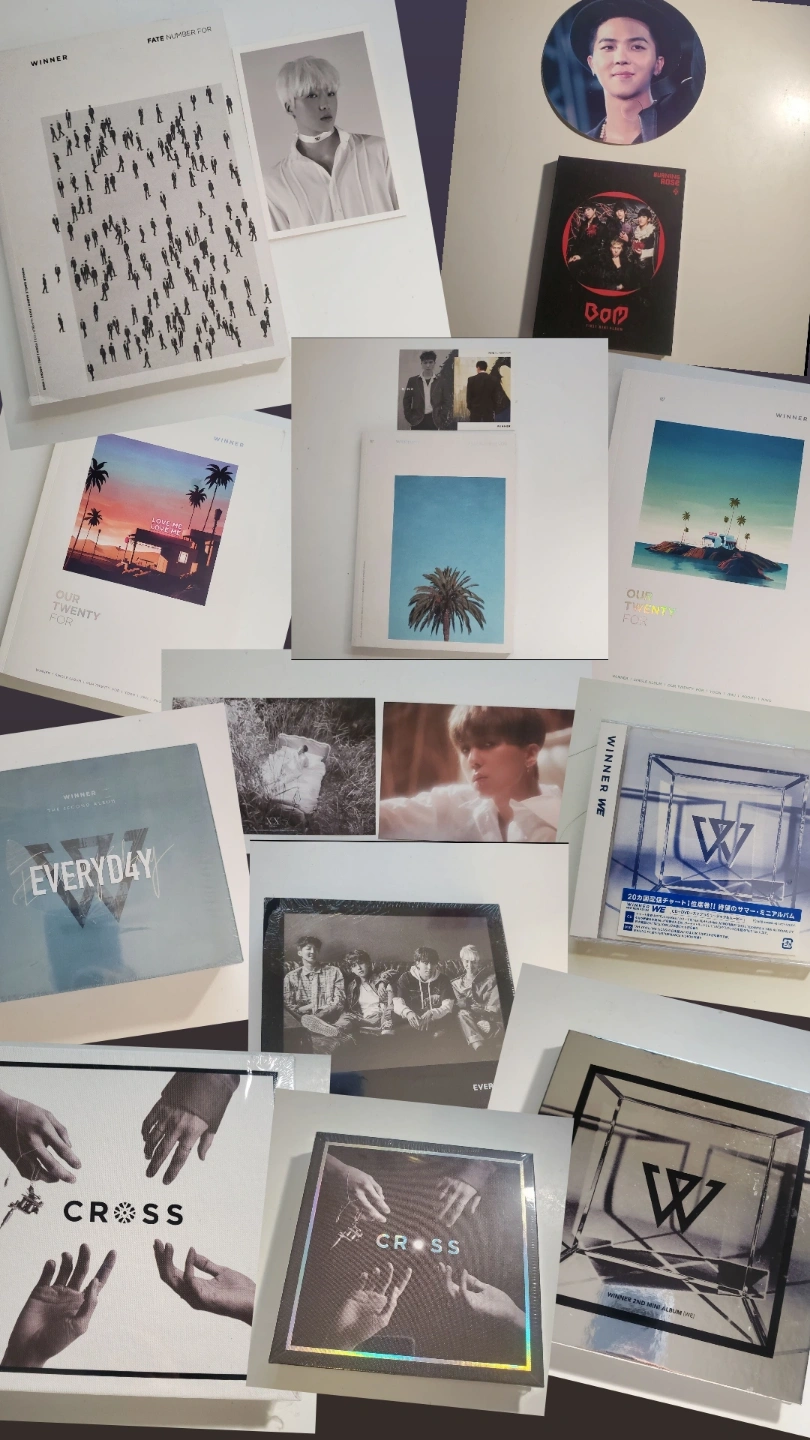 Collection of WINNER albums, photocards, and other memorabilia. Includes multiple album versions and photocards. Great for collectors.