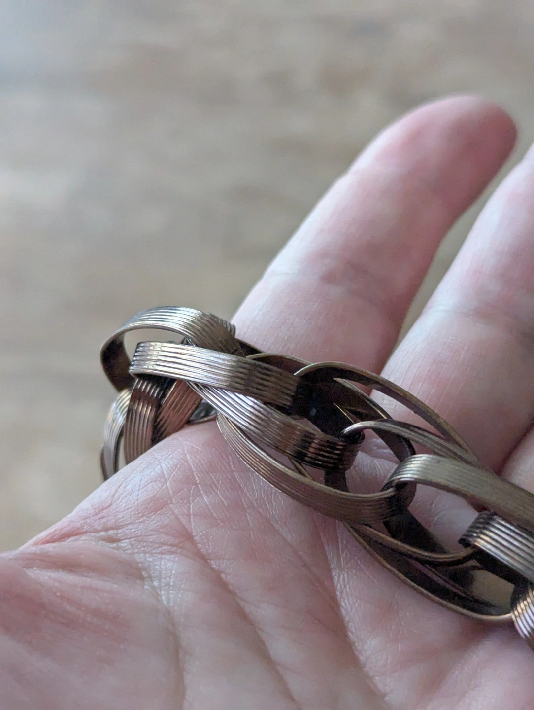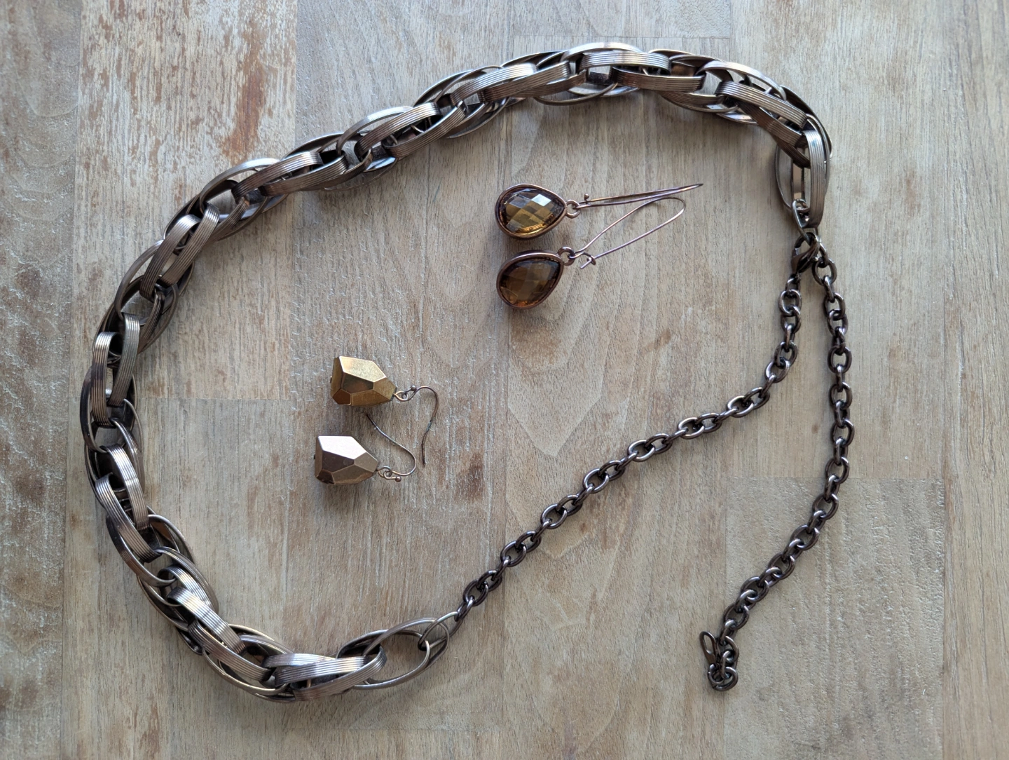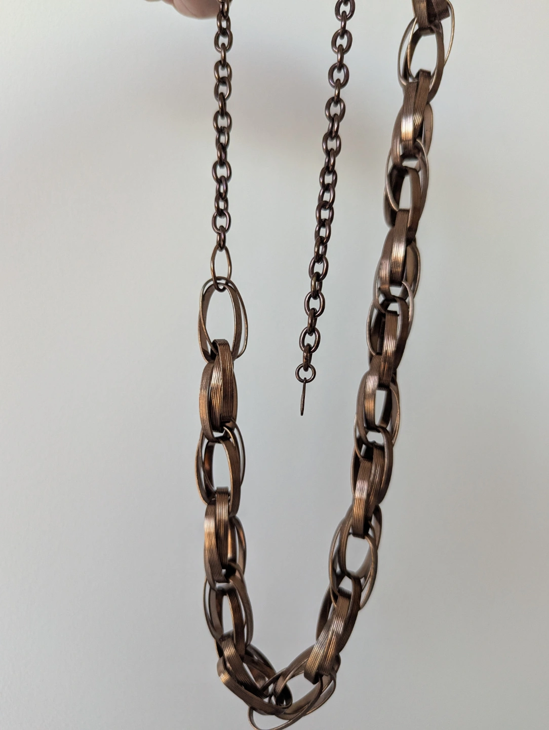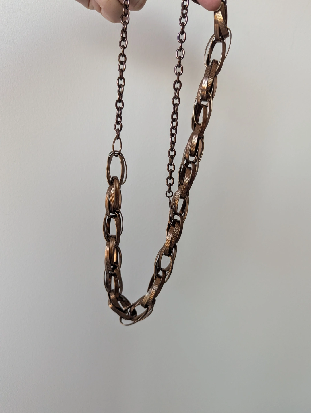 Long bronze chain link necklace. Features unique linked design. Includes an extender chain. Looks great with a simple outfit.