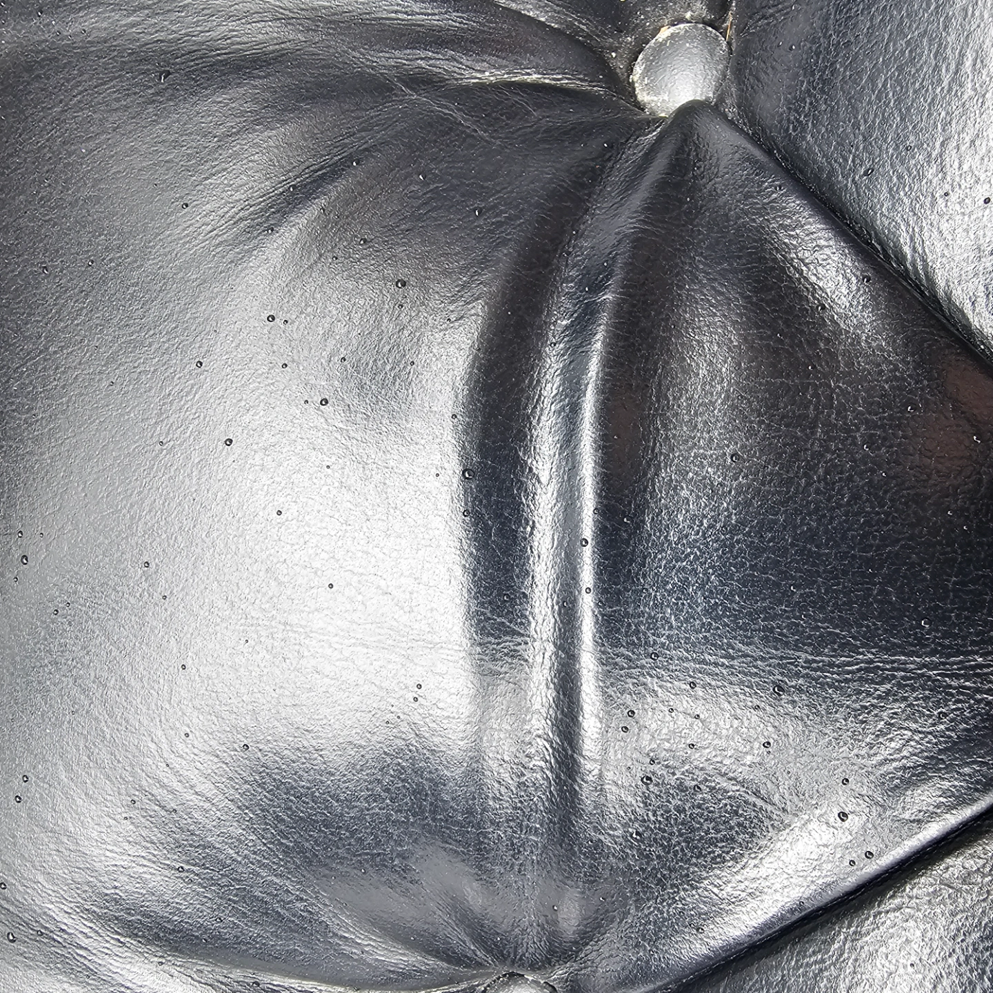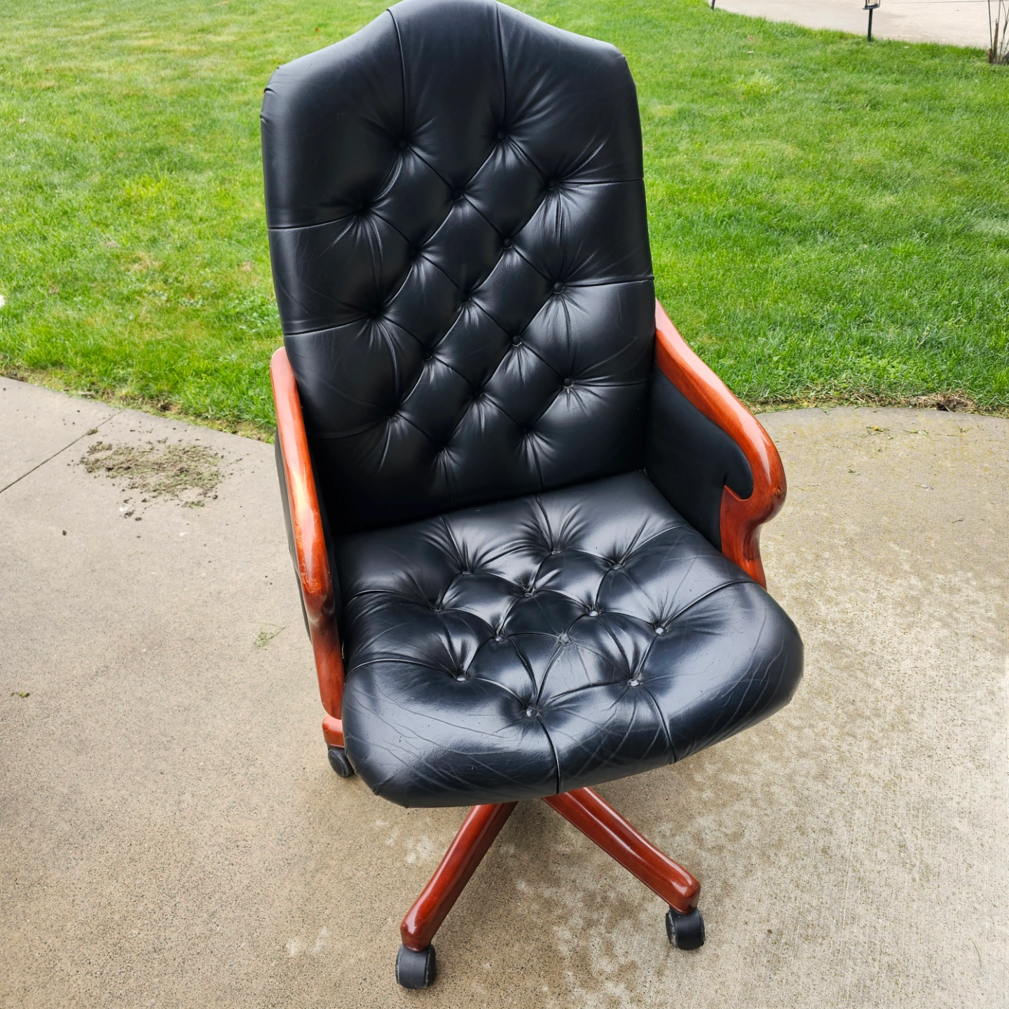 JOFCO executive office chair, featuring a black tufted leather seat and back, complemented by wood trim and a matching 5-star base. The chair is designed for comfort and style in any office setting. While it has been used, it remains in good condition, ready to provide support and a touch of elegance to your workspace.