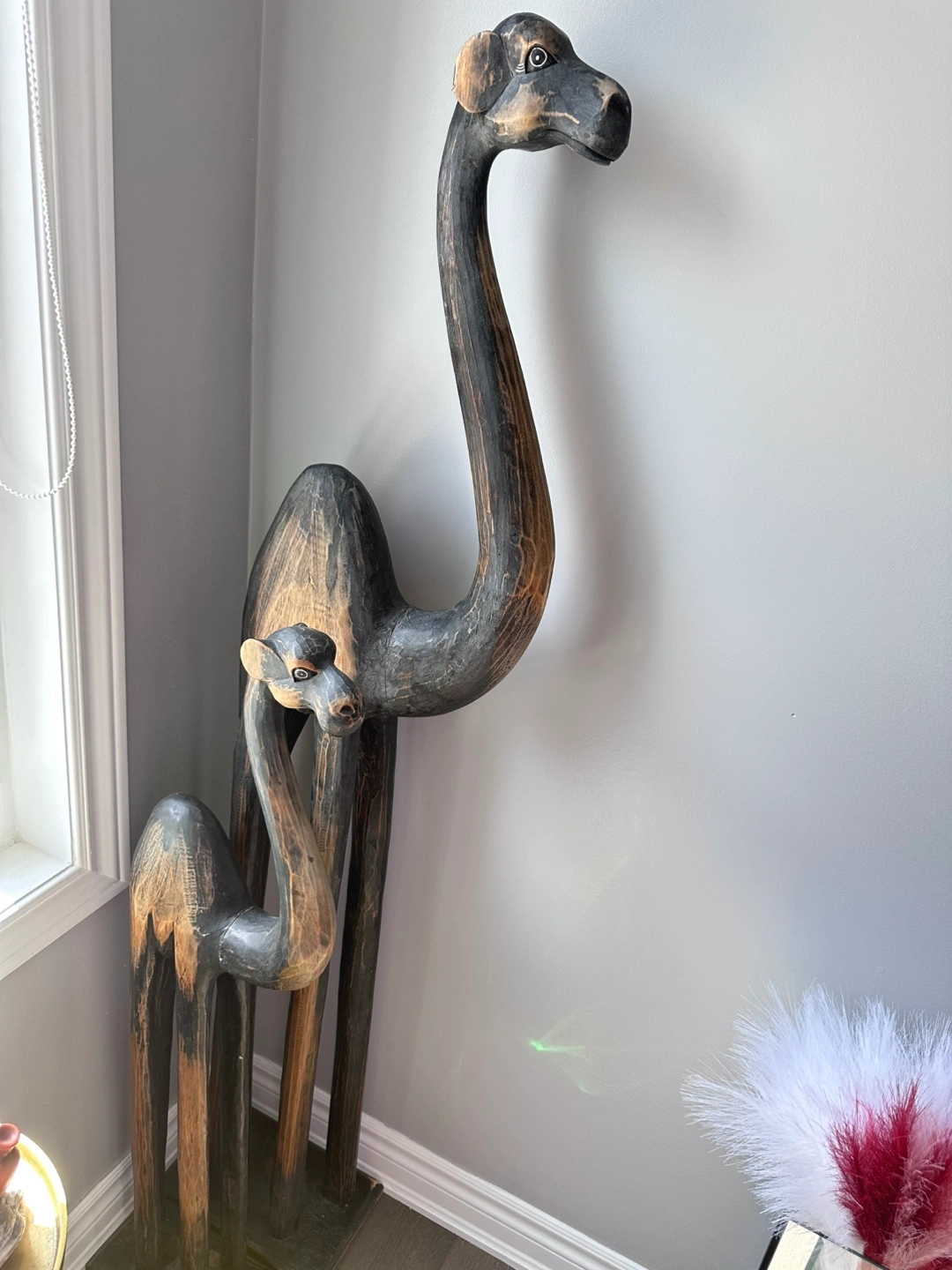 Pair of large wooden camel sculptures. Dark brown and black finish. Mother and baby camel design. Unique home decor. Tall and slender. Showstopper piece.