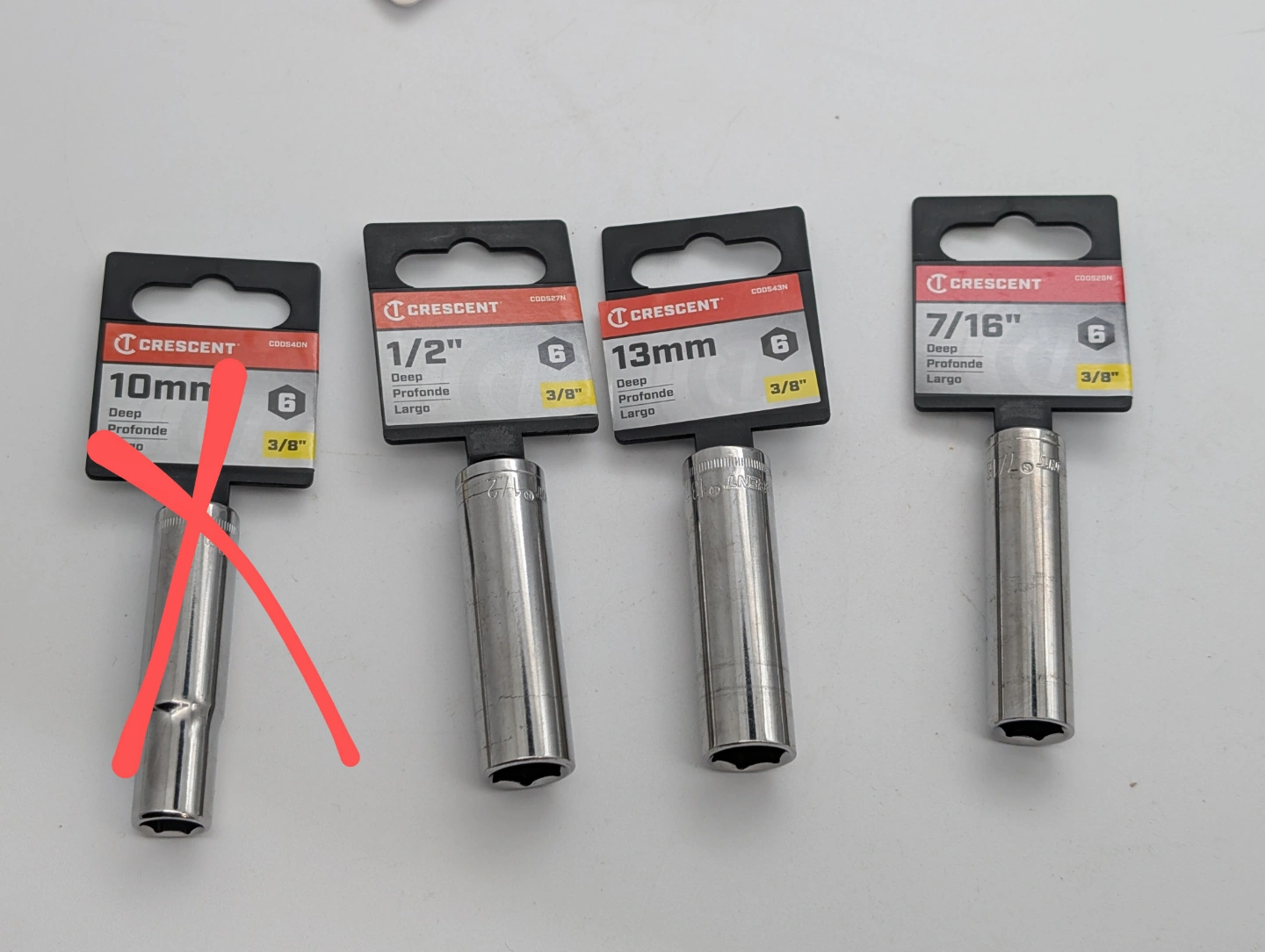 Buy & SellCrescent 3/8" Drive Deep Socket Set (1/2", 13mm, 7/16")Crescent 3/8" Drive Deep Socket Set (1/2", 13mm, 7/16")$5Four Crescent brand deep sockets. Sizes include 1/2", 13mm, and 7/16". All are 3/8" drive. $5 each or $10 for all.0 chats·0 favorites·7 viewsSELLERSeharArgyle996 reviewsWHERE TO MEETCarlyle Drive