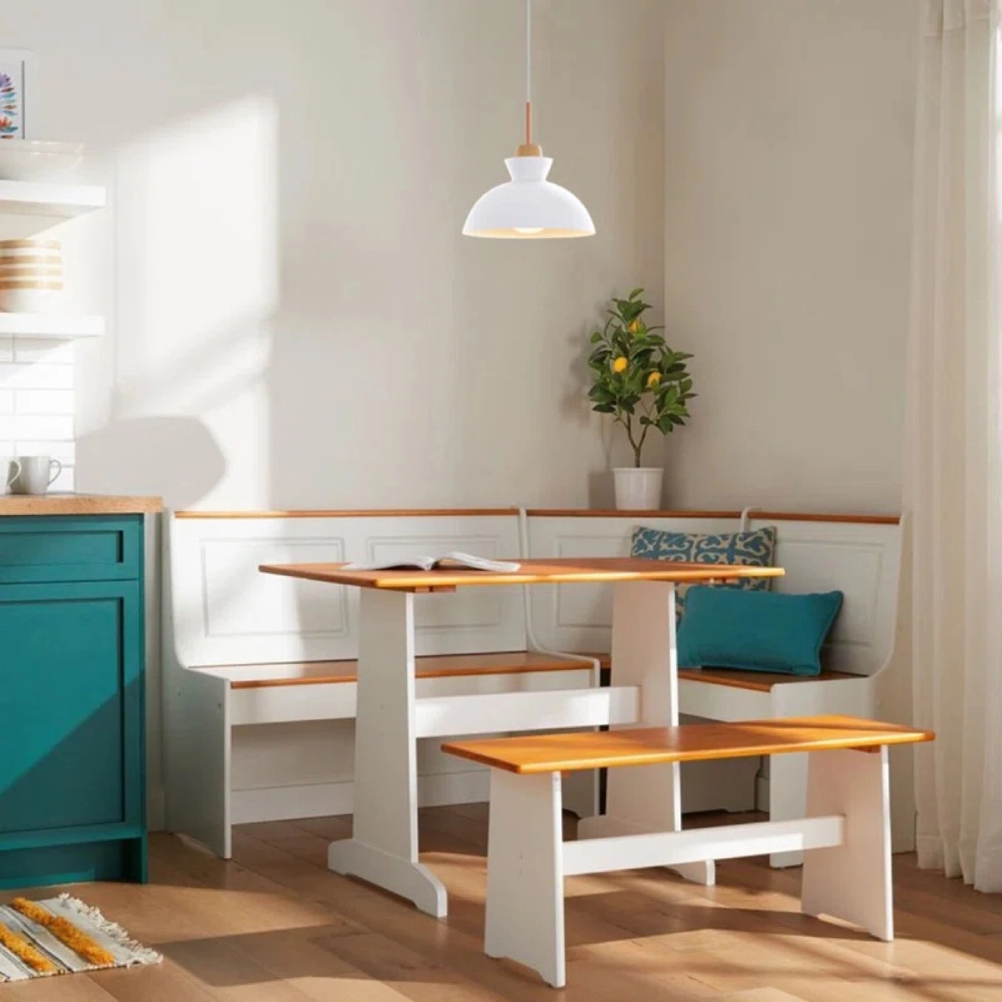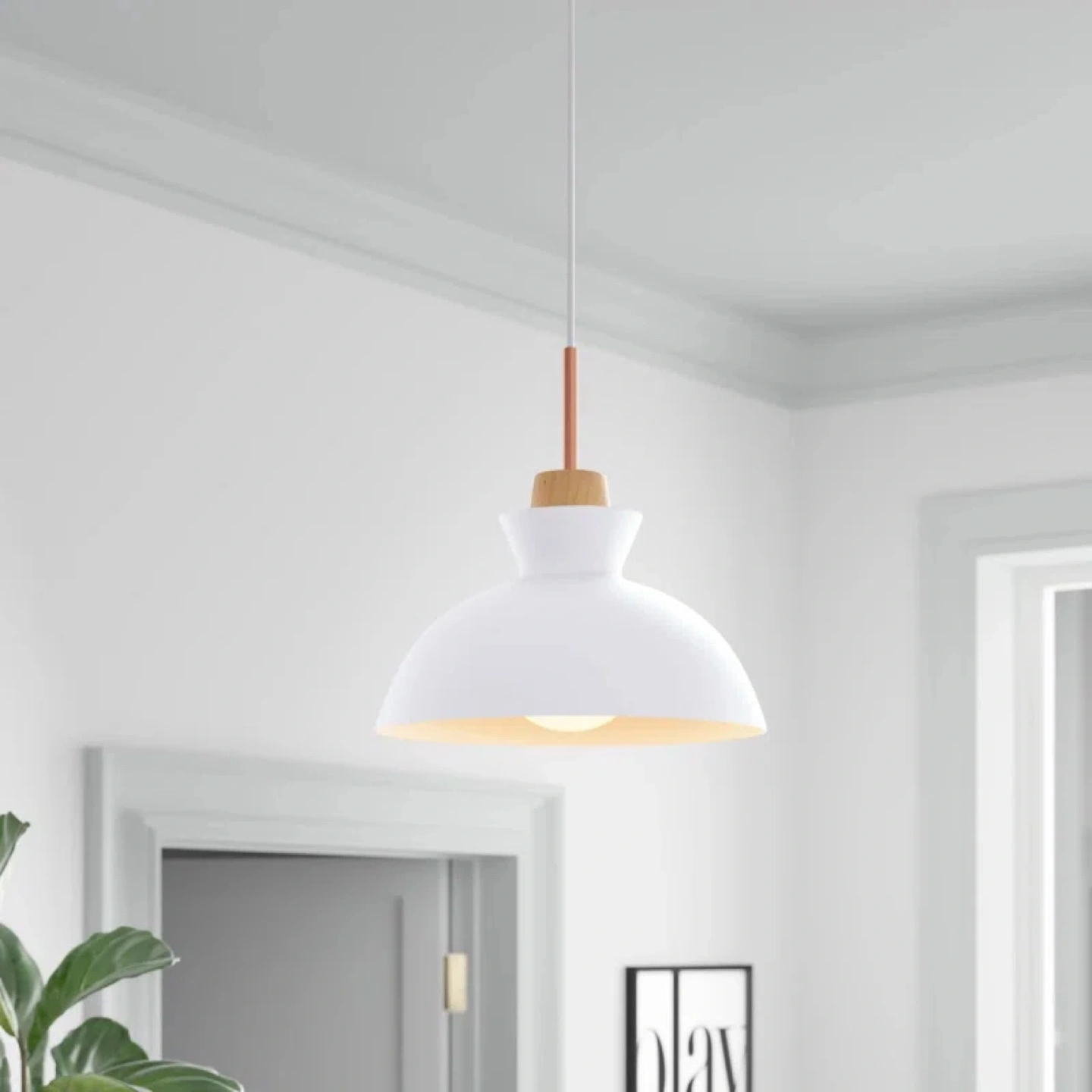 White pendant light fixture. Features a wood accent and dome shade. Simple design, perfect for kitchens or dining rooms.