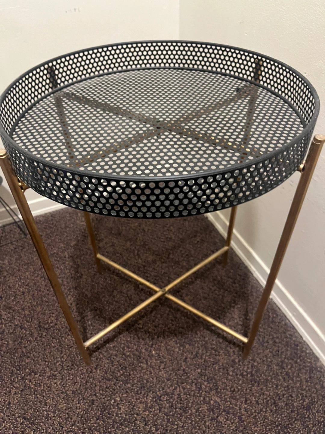 Round side table. Black metal top with gold-coloured metal legs. Stylish and functional. Perfect for a living room or bedroom.
