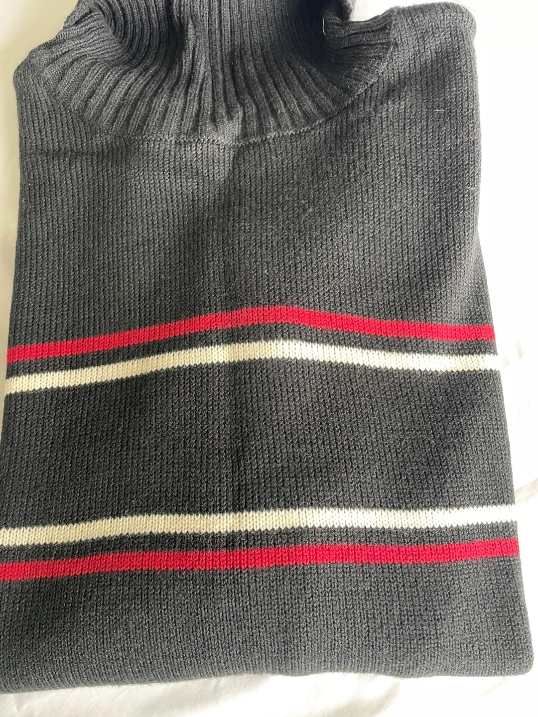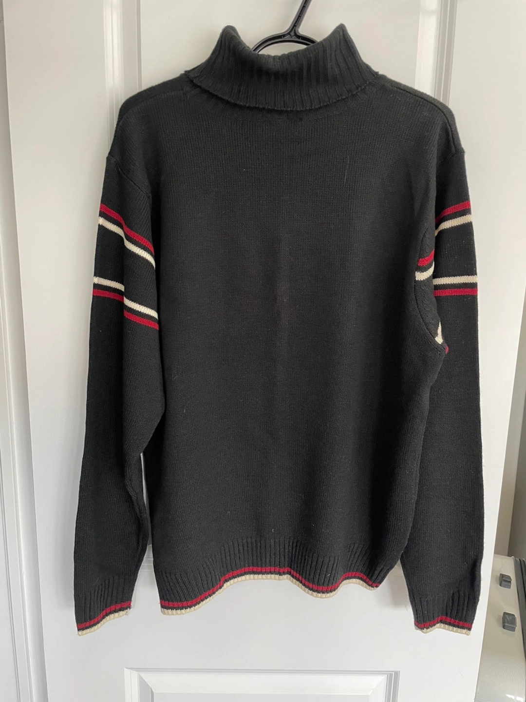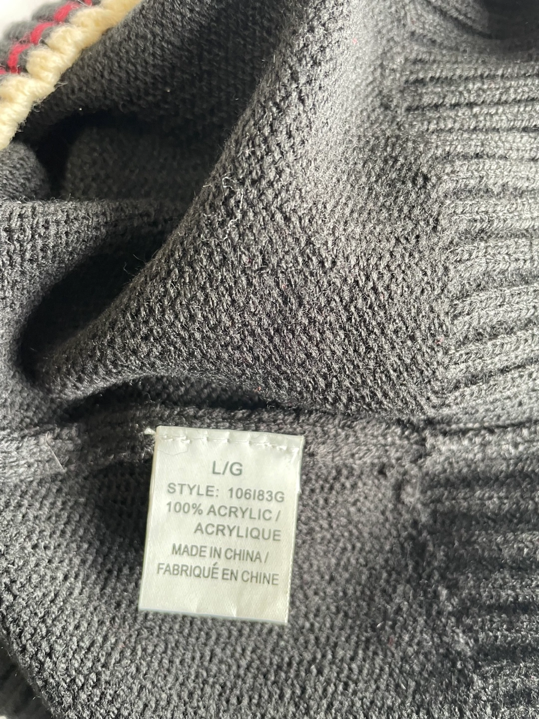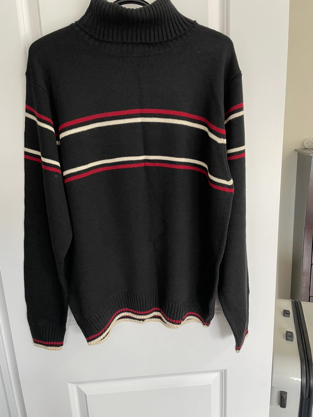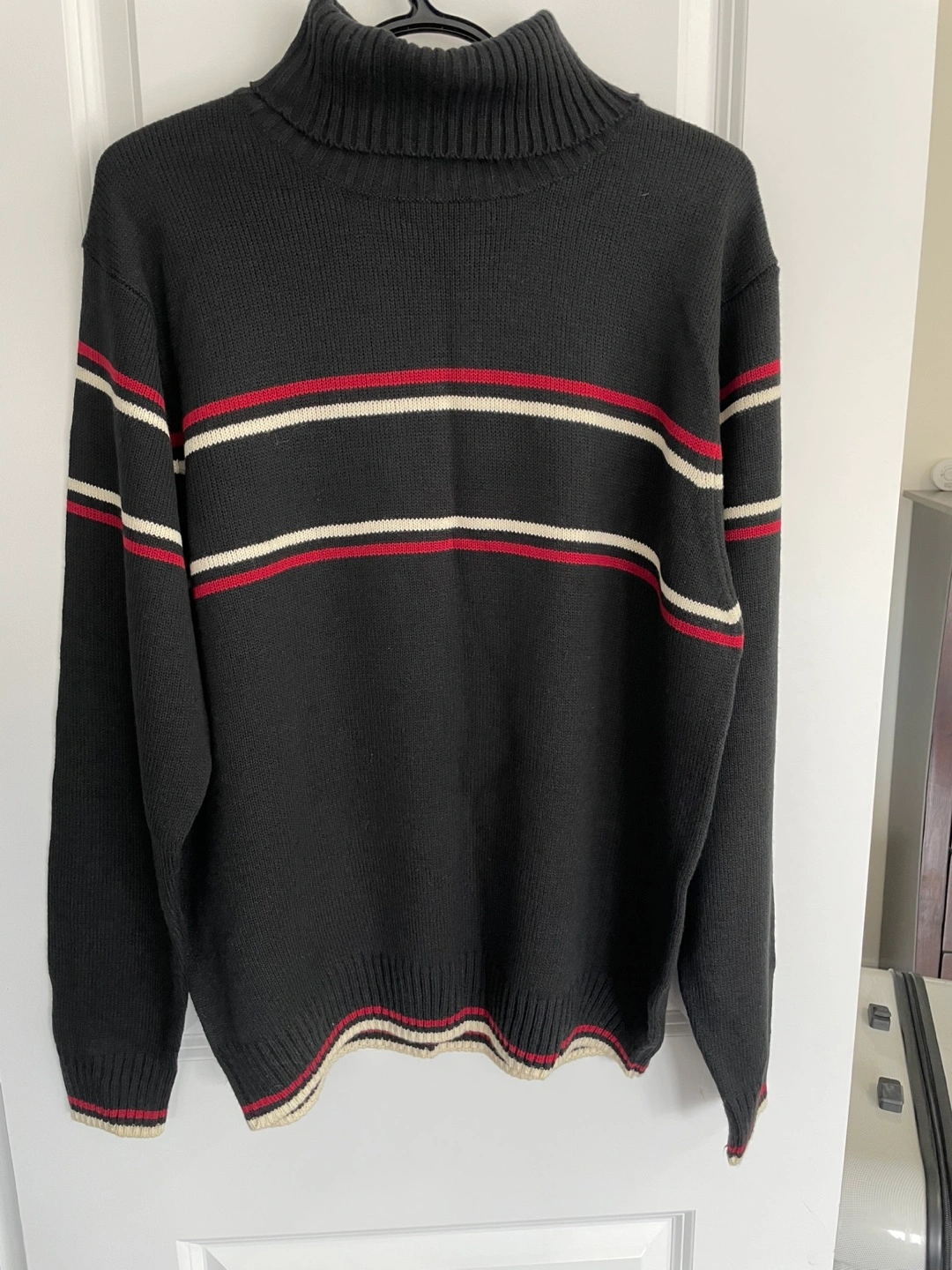Long sleeve turtleneck sweater. Black with cream and burgundy stripes. Size large. 100% acrylic. Made in China.