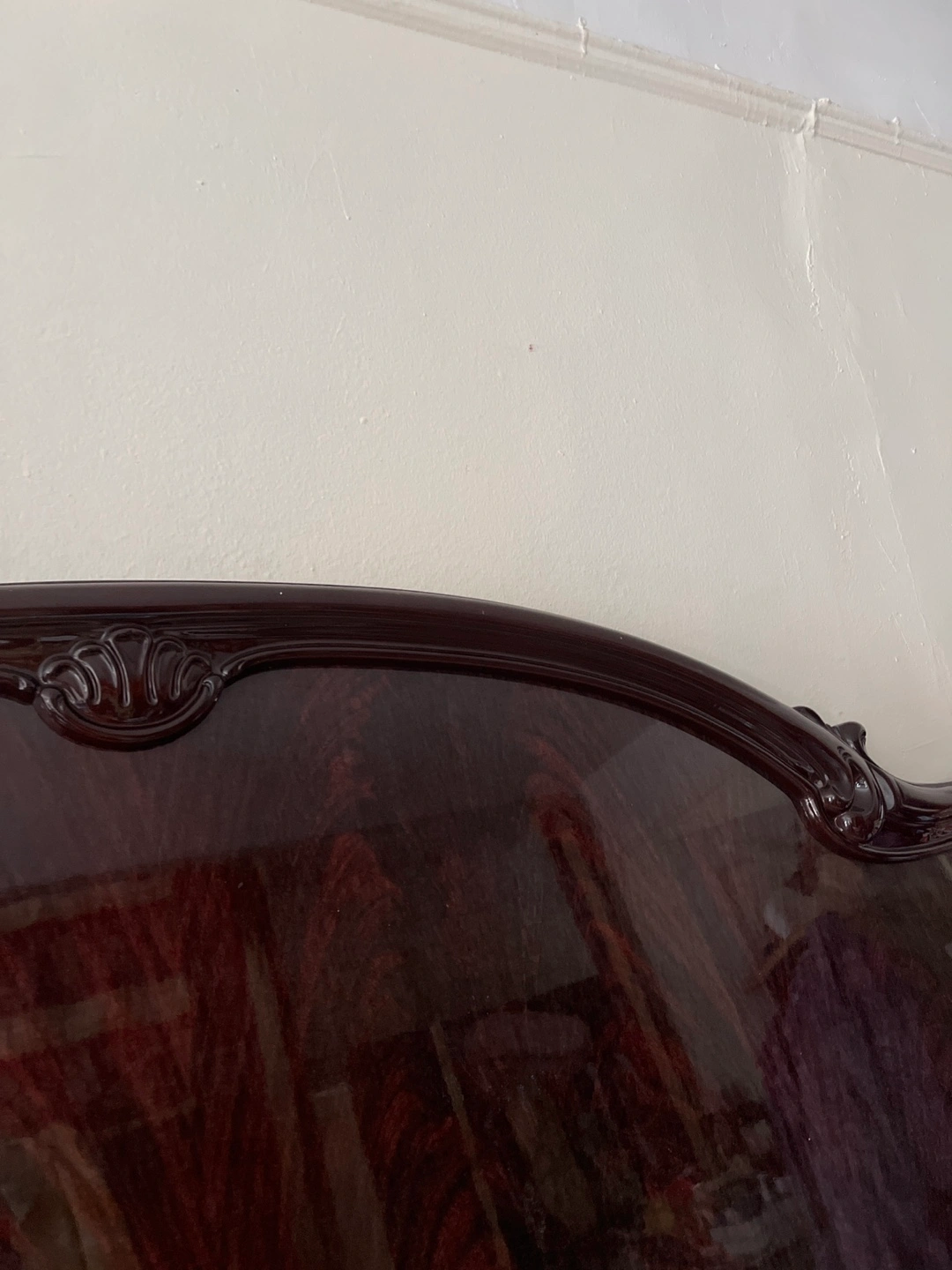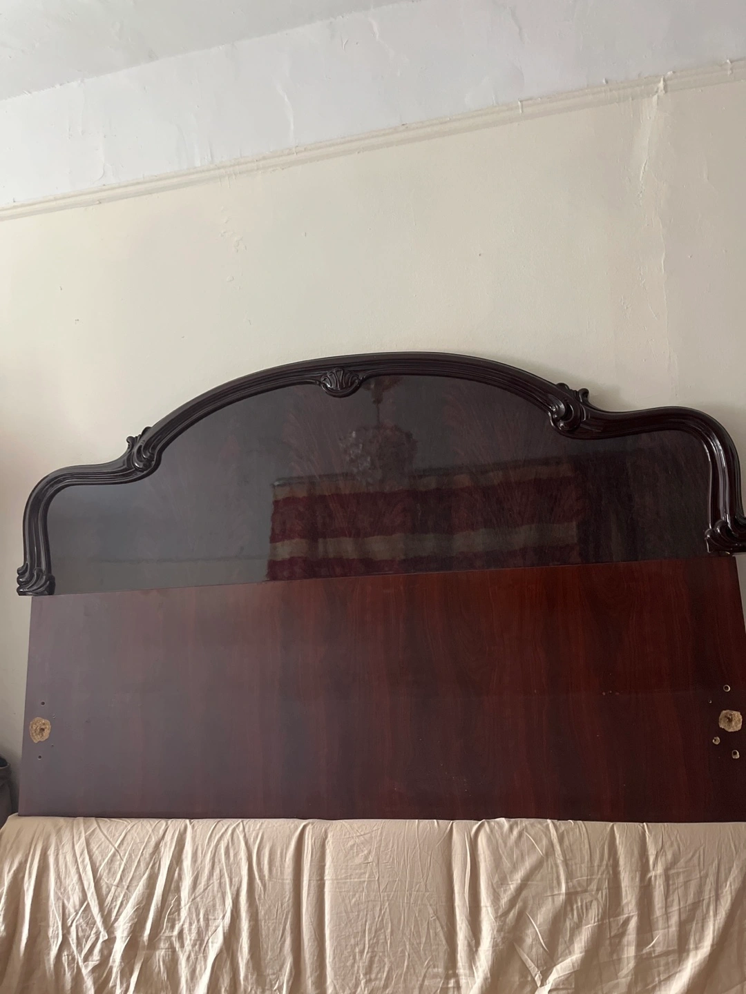 Beautiful dark cherry color bedroom set. Includes a dresser, headboard, and mirror. Elegant style. Some wear and tear.