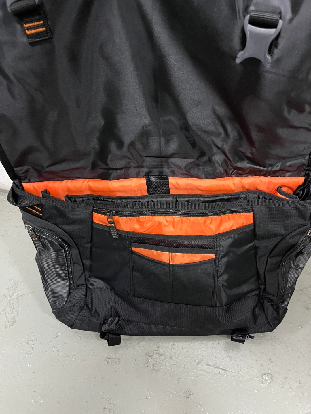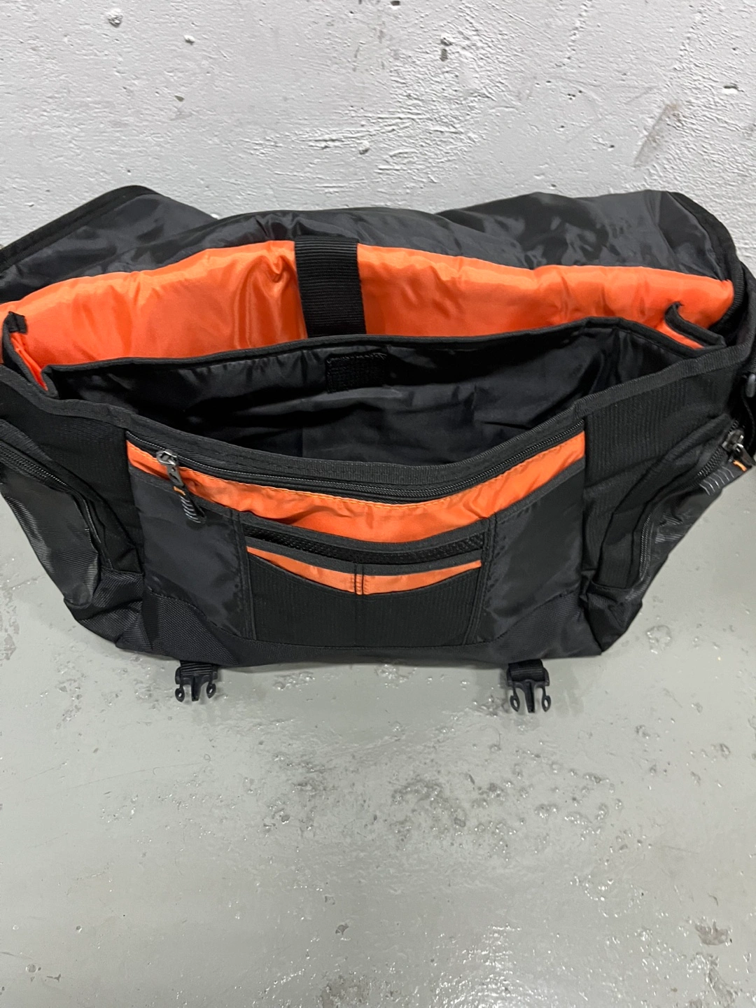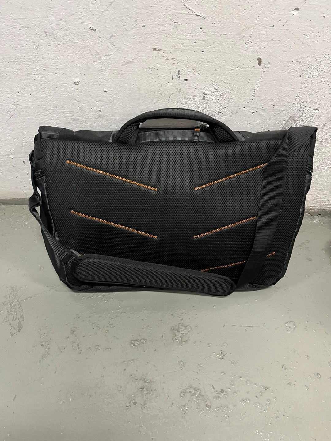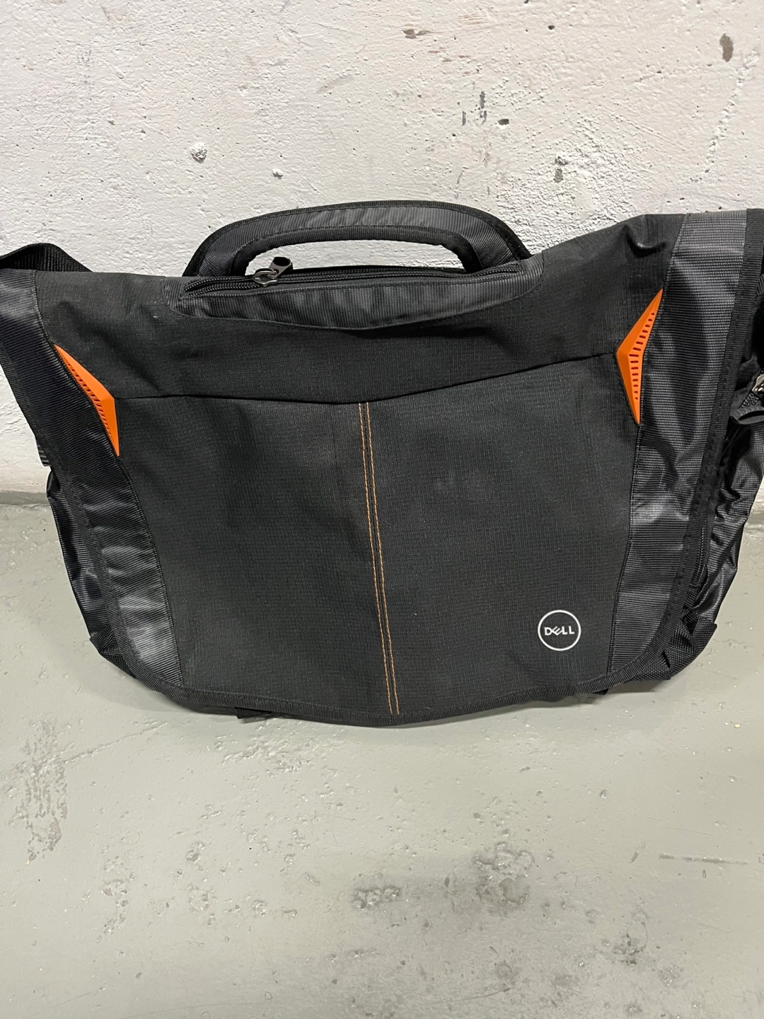 Black messenger bag/briefcase by Dell. Features orange accents. Multiple compartments and pockets. Adjustable shoulder strap. Durable material.