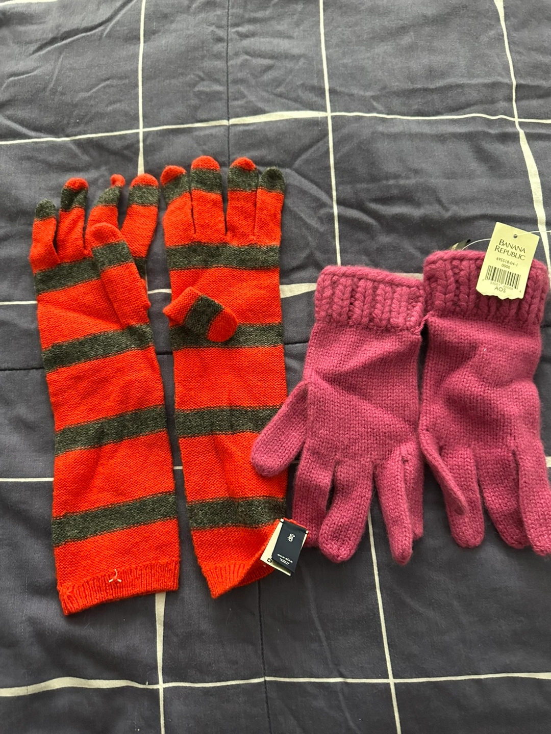 Pair of striped long gloves and a pair of solid pink gloves. Orange and gray stripes. Size small.