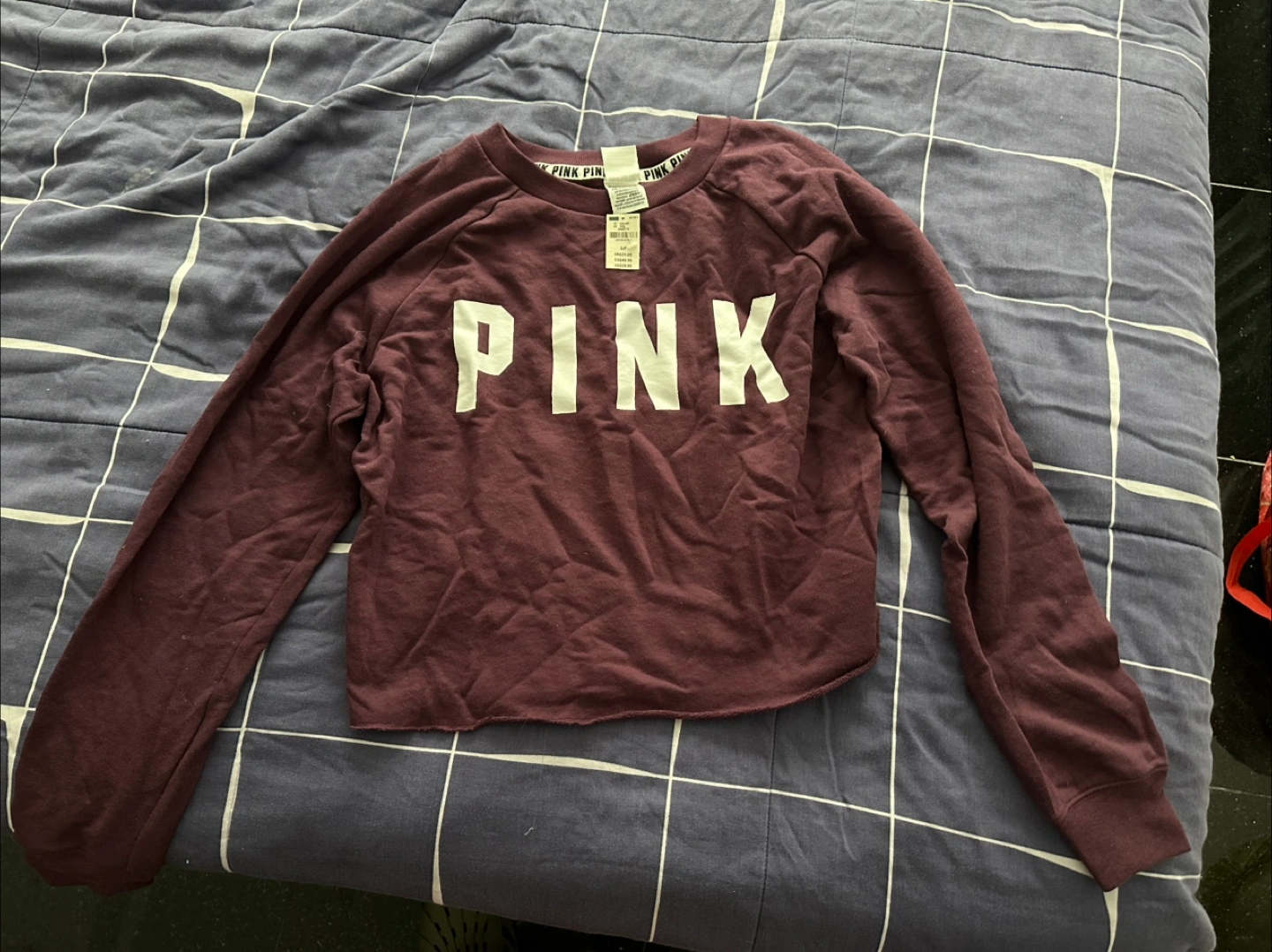 Long sleeve cropped sweatshirt. Maroon color. Features large white PINK logo across the chest. Slightly cropped hem. I need to clean up my closet. New with tag.