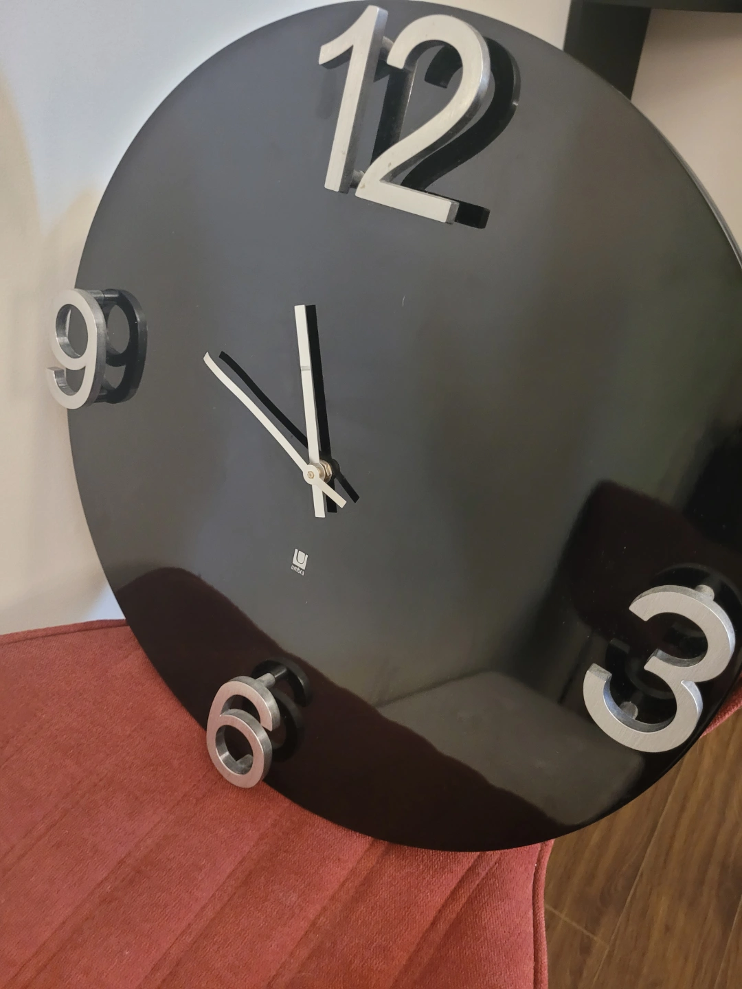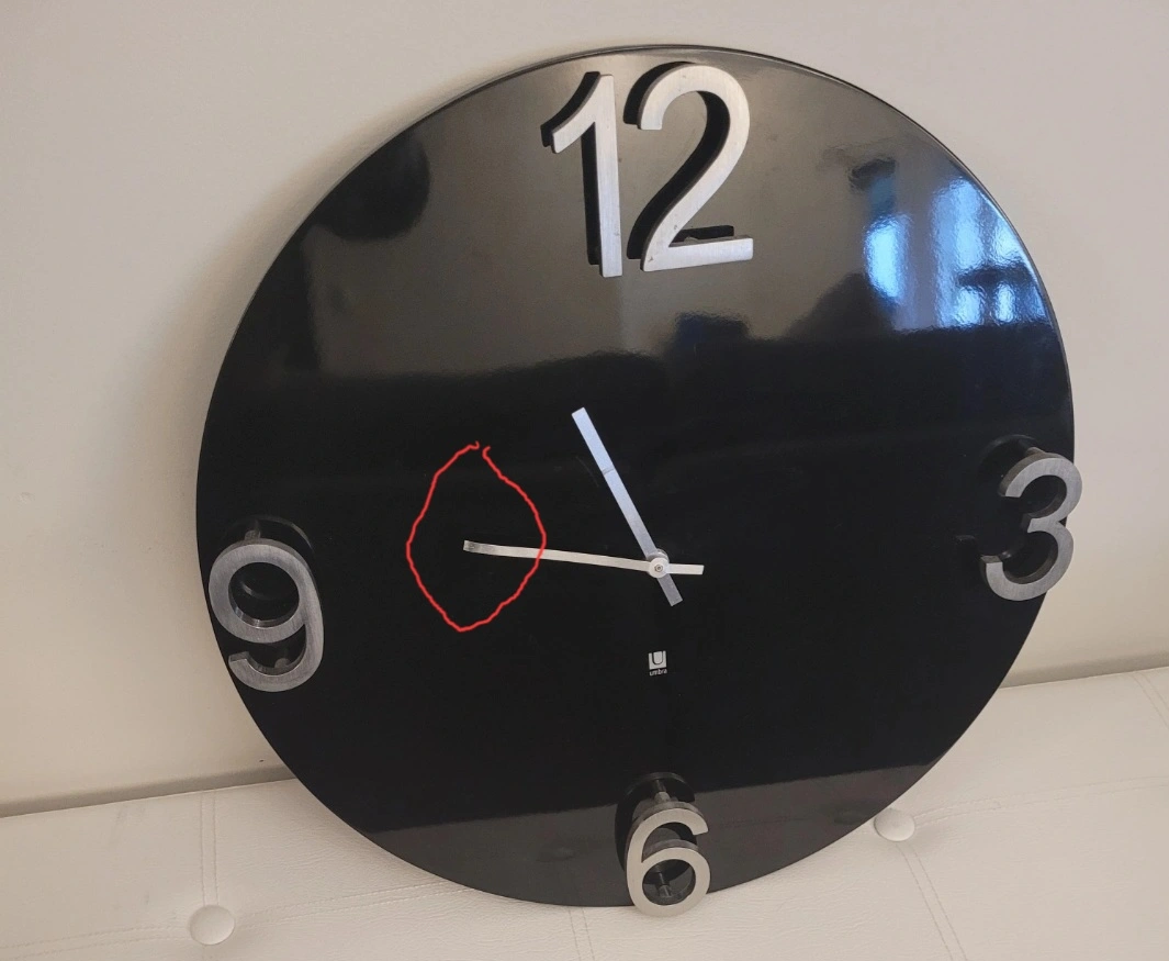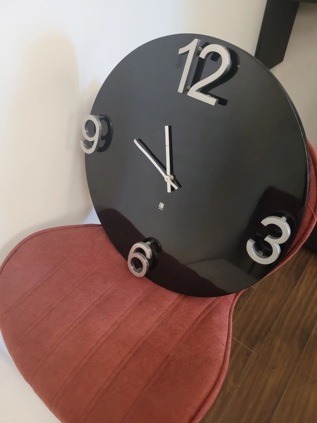 Please see all pictures Round black wall clock. Features large, raised silver numbers. Stylish design. Battery operated.