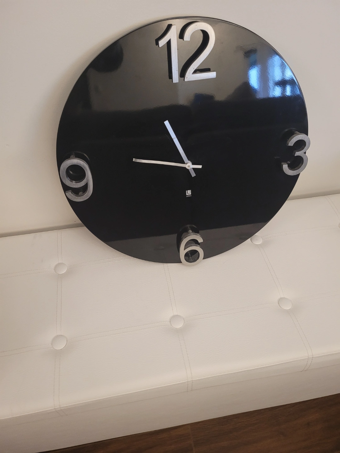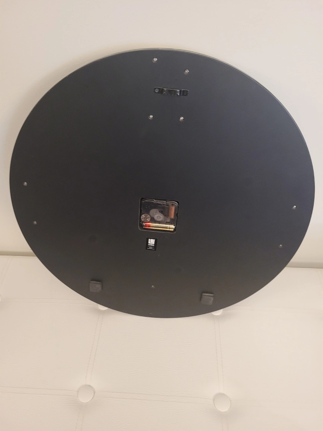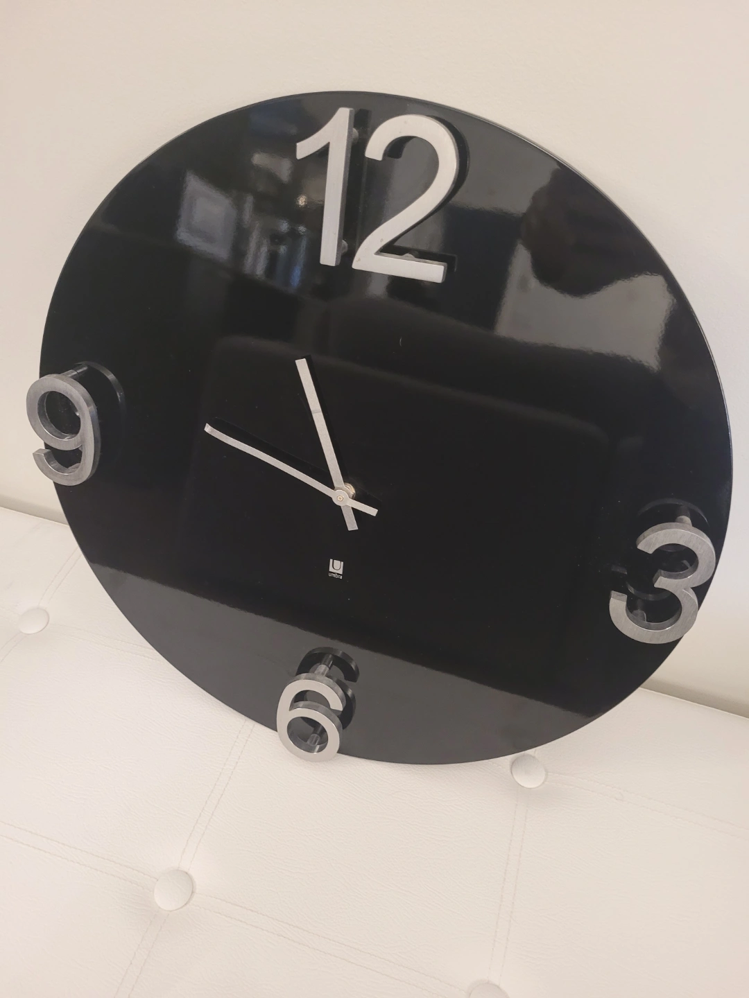 Please see all pictures Round black wall clock. Features large, raised silver numbers. Stylish design. Battery operated.