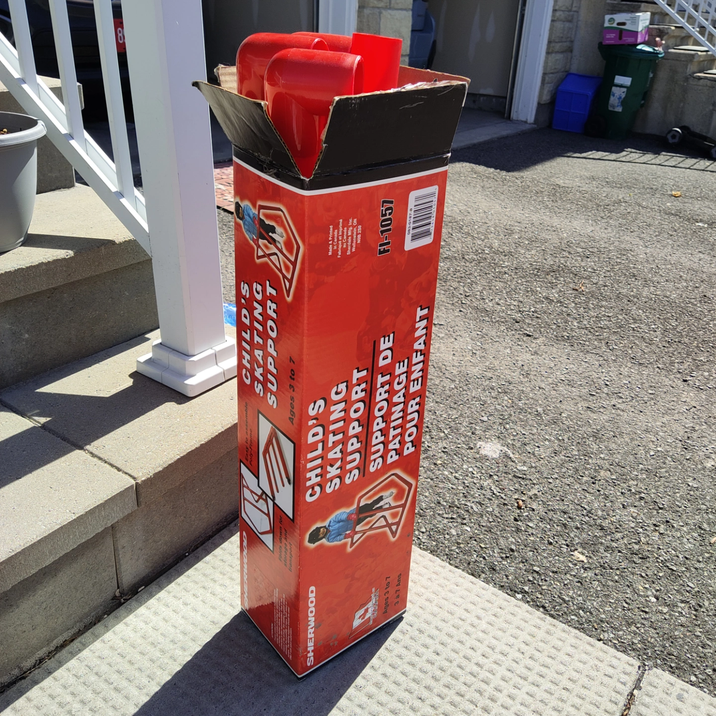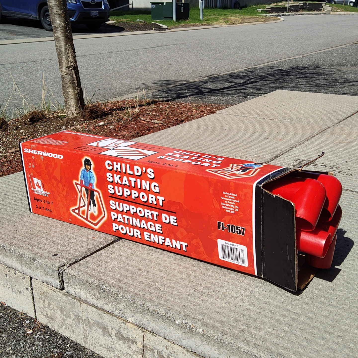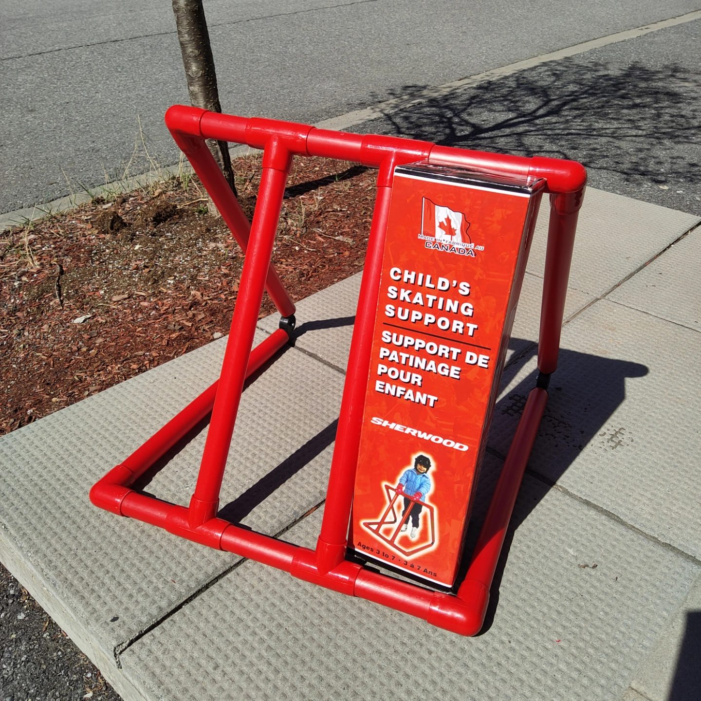 Red child's skating support. Model FI: 1057 (Lil' Skater). Ages 3 to 7. PVC construction. Portable and lightweight. Great for learning to skate. Made in Canada.