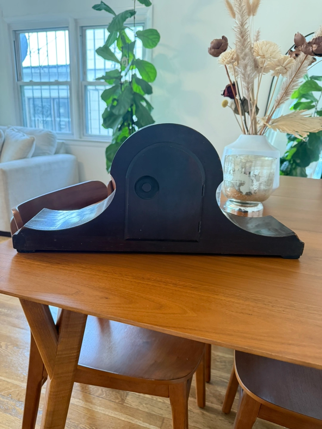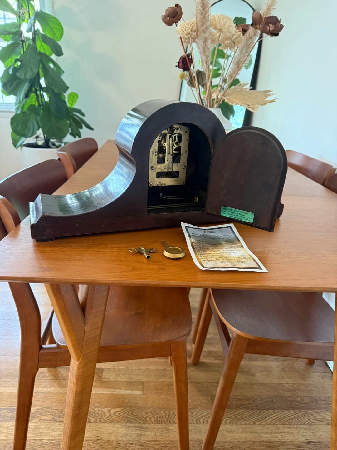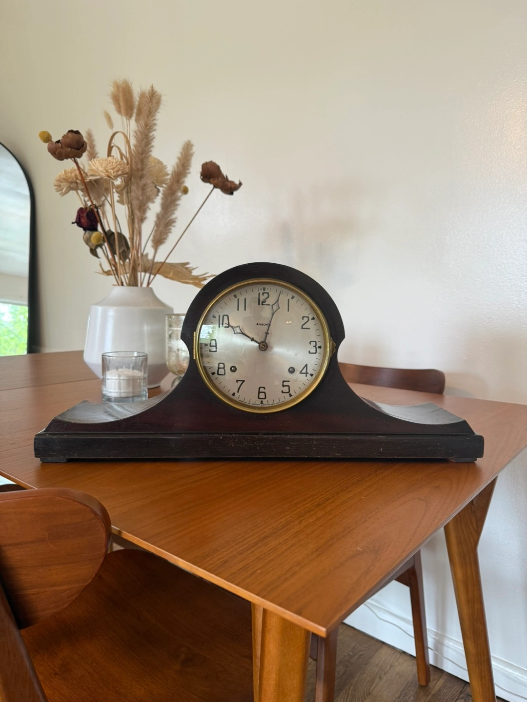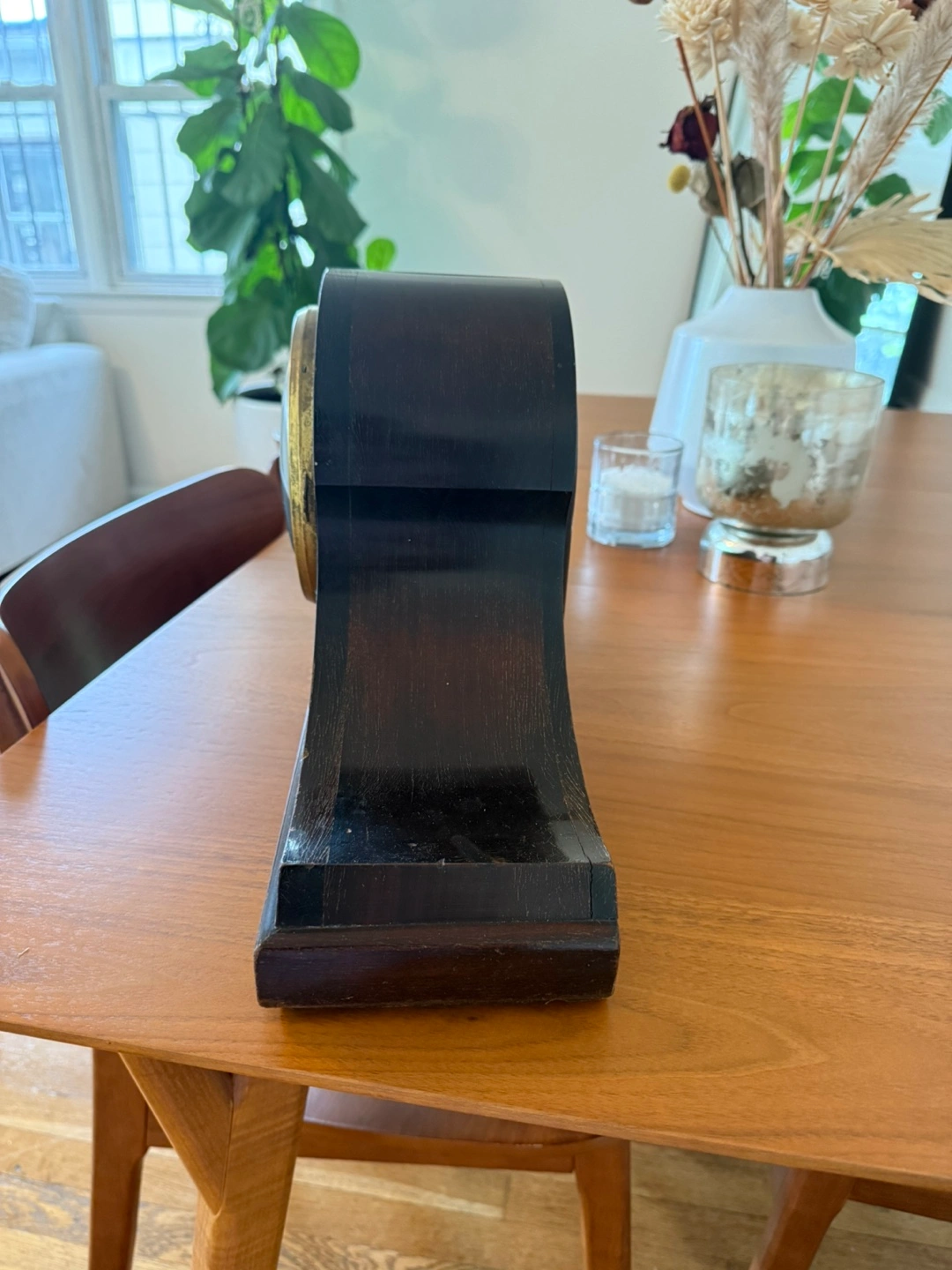 Vintage wooden mantle clock. Brass accents. Includes key and pendulum. Recently serviced. Description of serviced included.
