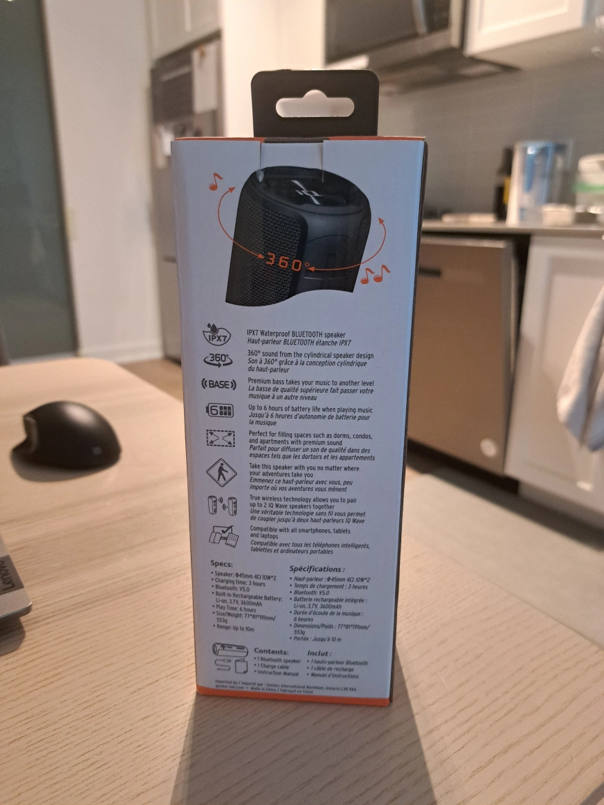 Portable Bluetooth speaker. Waterproof and splashproof. 360° sound. Long battery life. Compact and easy to transport. Perfect for parties, travel, or everyday use.