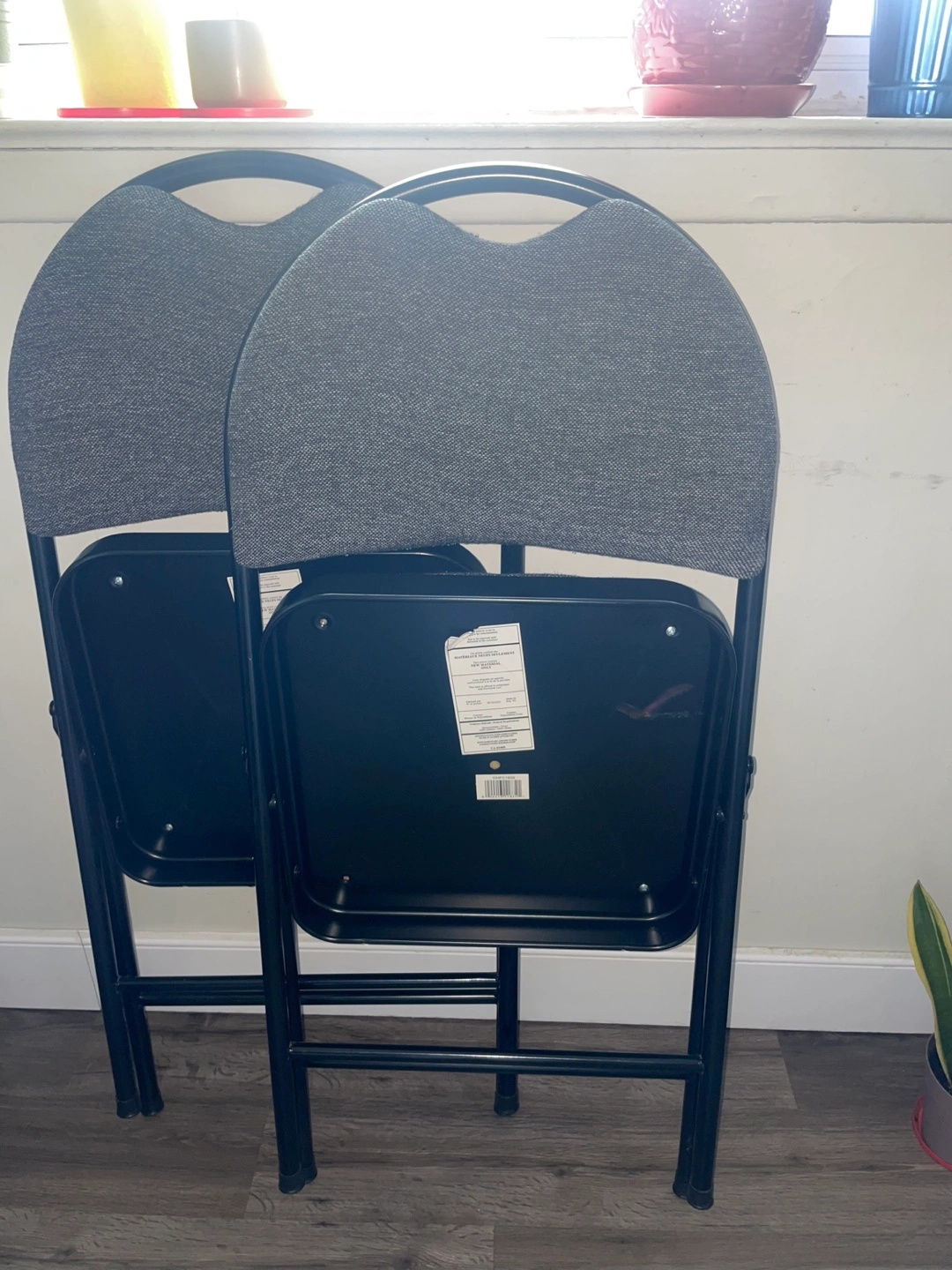 Two grey folding chairs. Metal frame. Fabric seat and backrest. Good for extra seating.