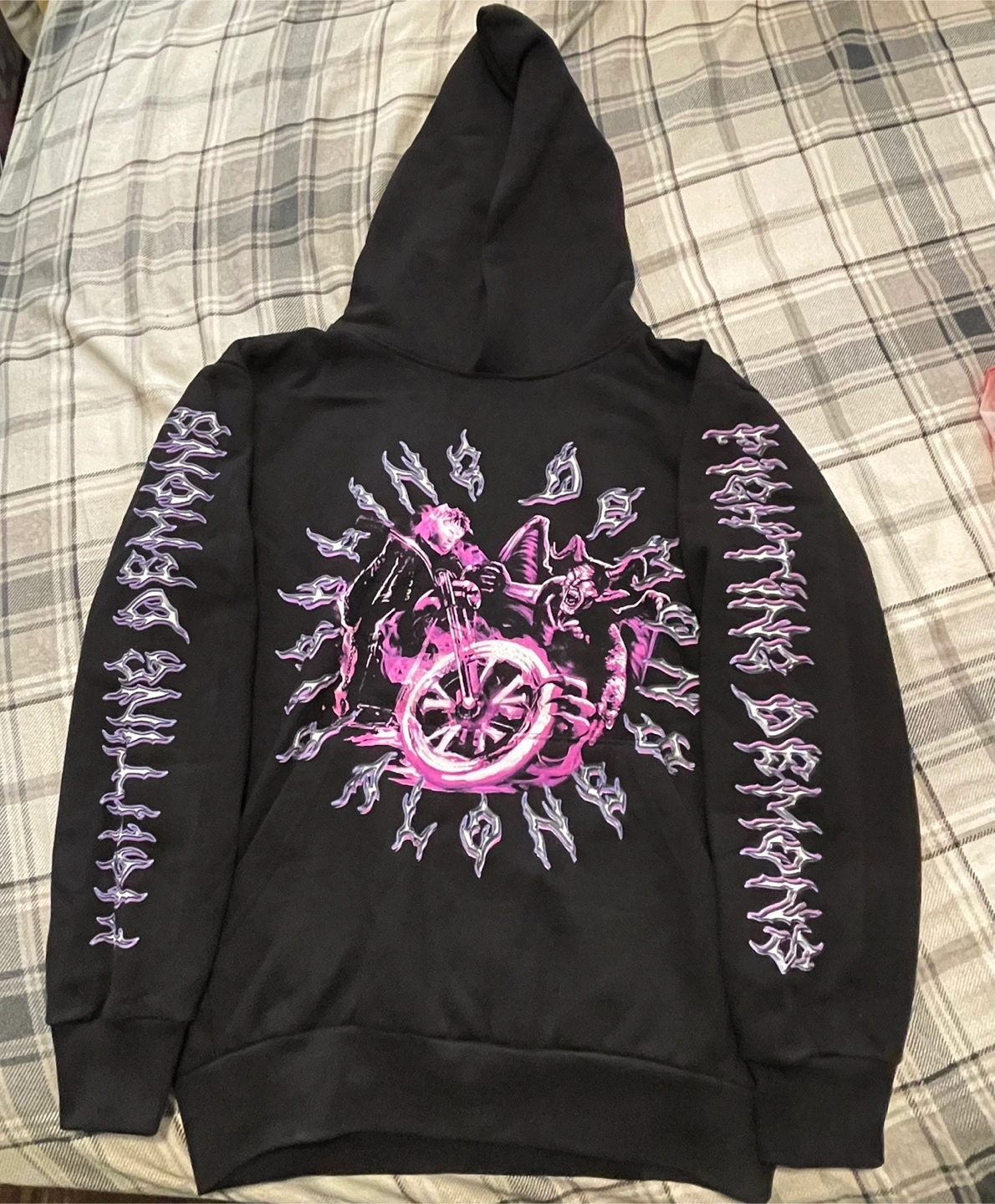 Black hoodie. Features a graphic design on the front and back. Long sleeves. Purple and black colour scheme.