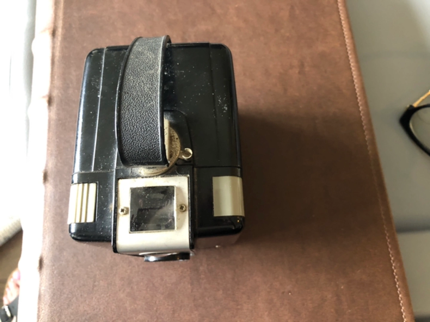 Vintage Brownie Hawkeye Flash Model camera. Black plastic body. Features a built-in flash. Carry handle. Great for collectors.