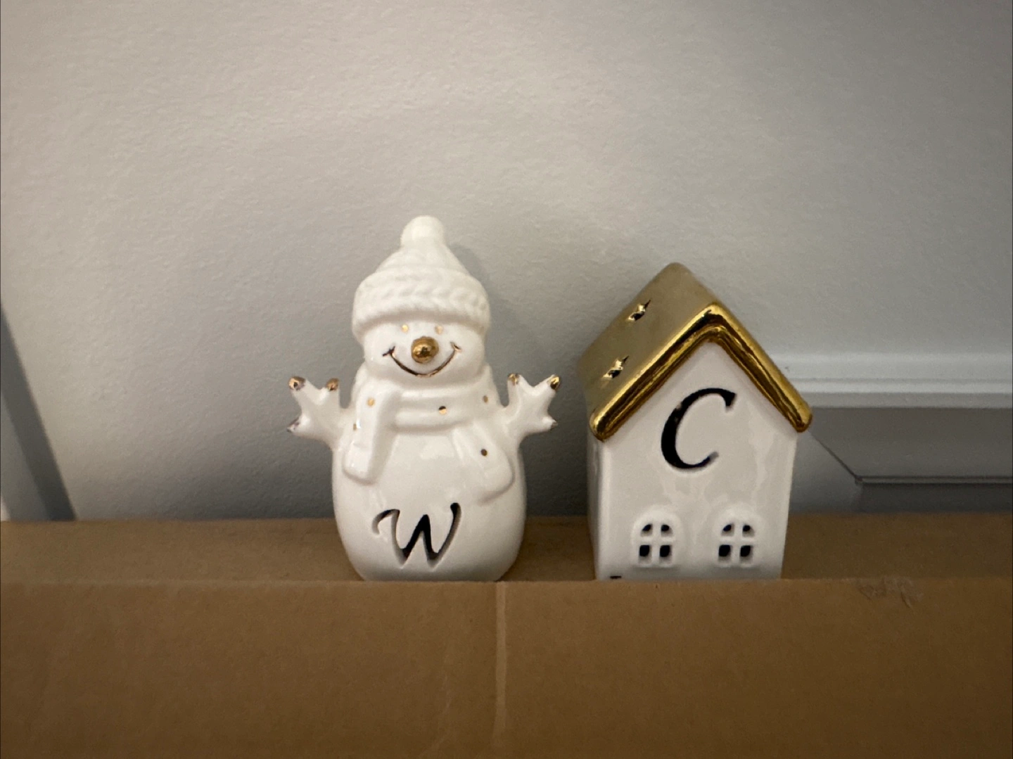 Adorable ceramic Christmas decorations. Features a snowman and a little house. Gold accents. Perfect for holiday decor. (house lights up)
