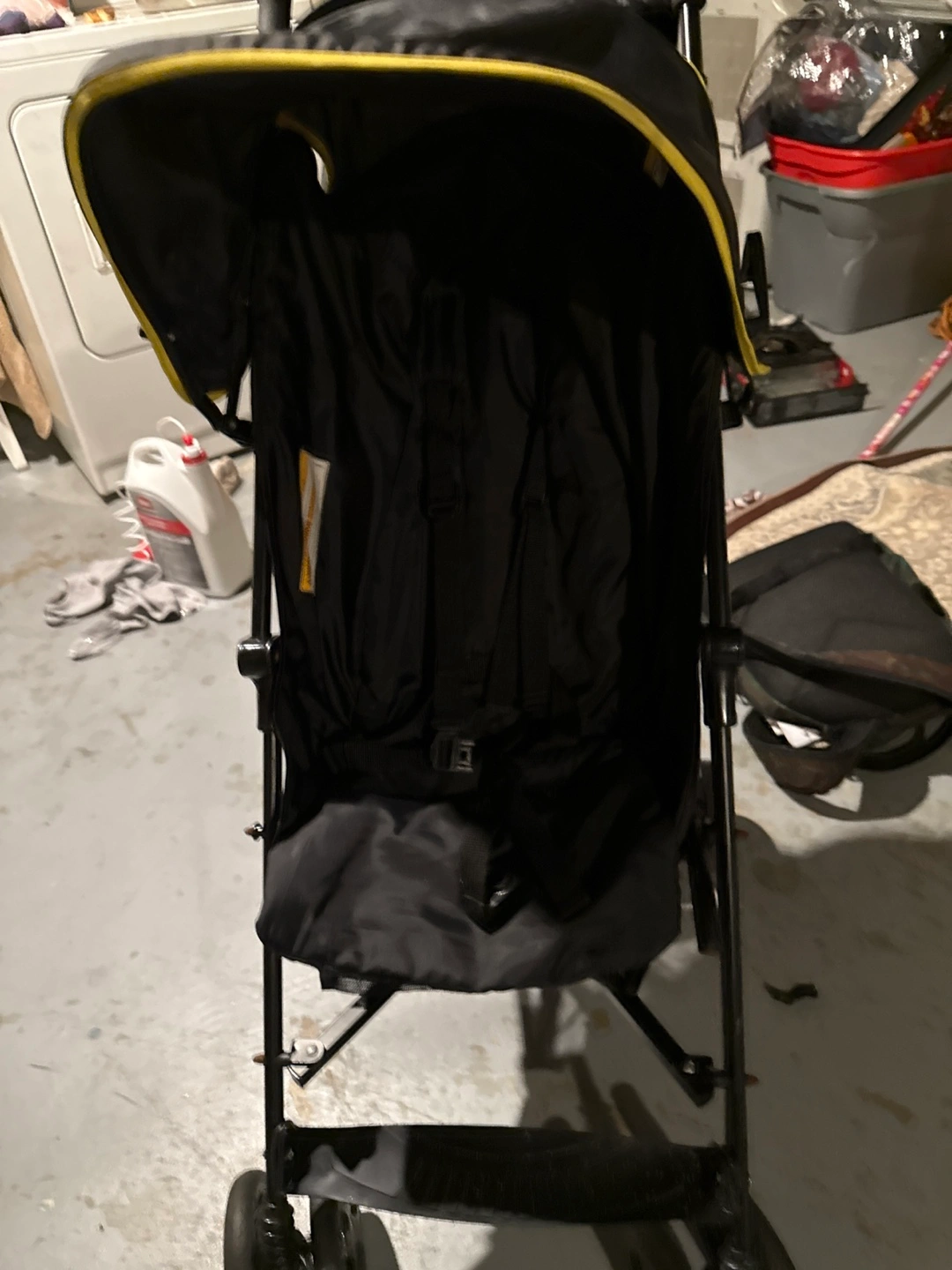 Lightweight umbrella stroller. Black fabric with yellow accents. Foldable design. Suitable for toddlers and young children. Includes storage basket.