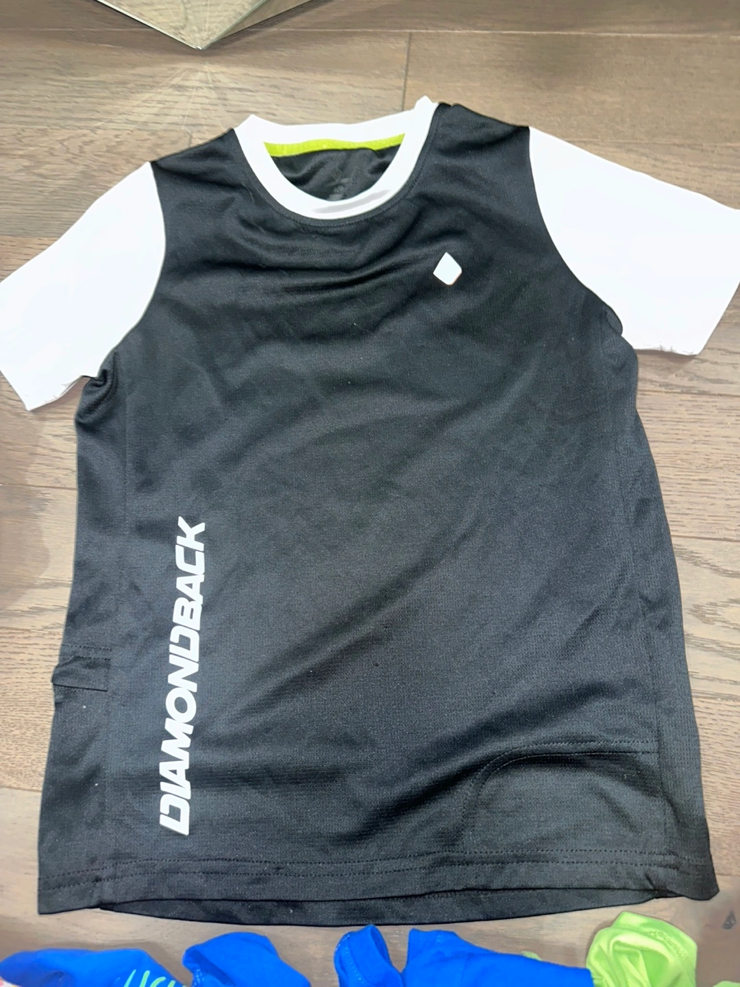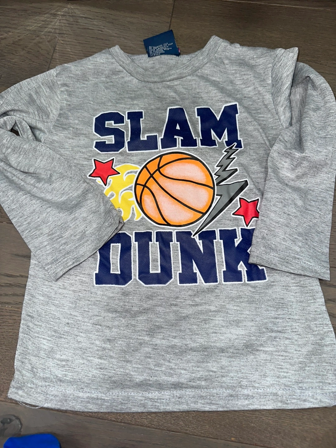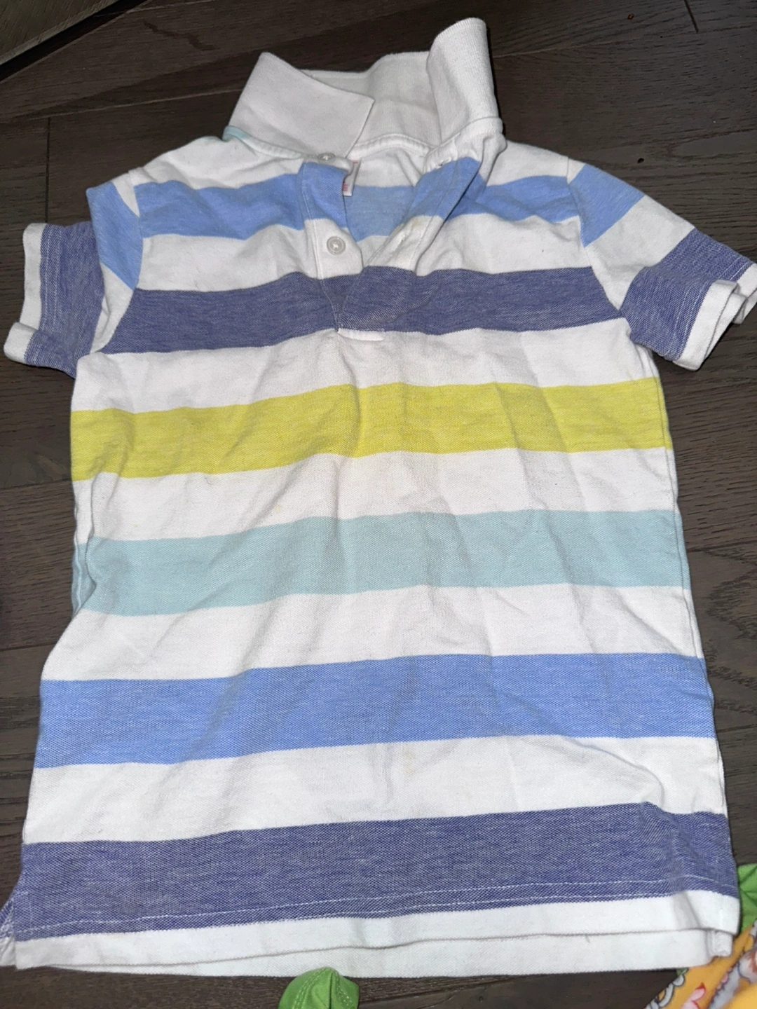 Five boys' shirts, various styles and colours. Includes striped polo shirt, blue graphic tee, navy tee, another navy tee, and grey long-sleeve basketball tee. Good some brand new and some good used condition. Prices vary