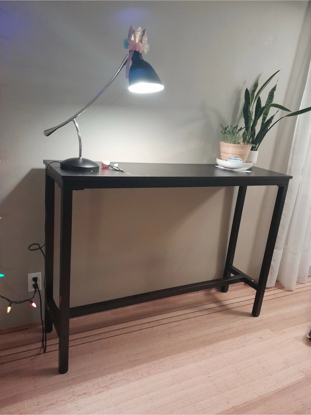 Long narrow black console table. Simple design. Metal legs. Great for entryway or hallway. Small scratches on top.