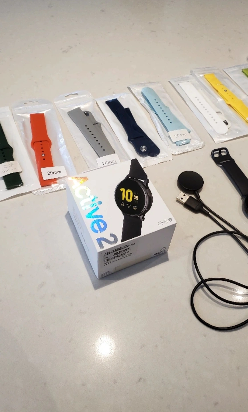 This listing is for a Samsung Galaxy Watch Active 2. (44mm) It includes the watch, box, charger, and nine extra bands. It was a gift, used 3 or 4 times.