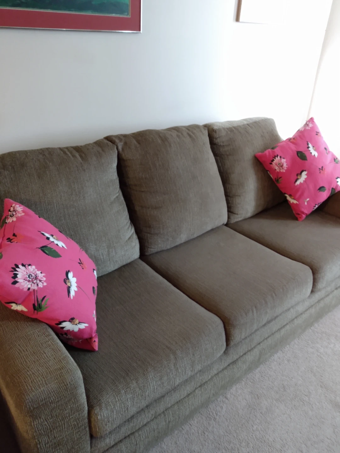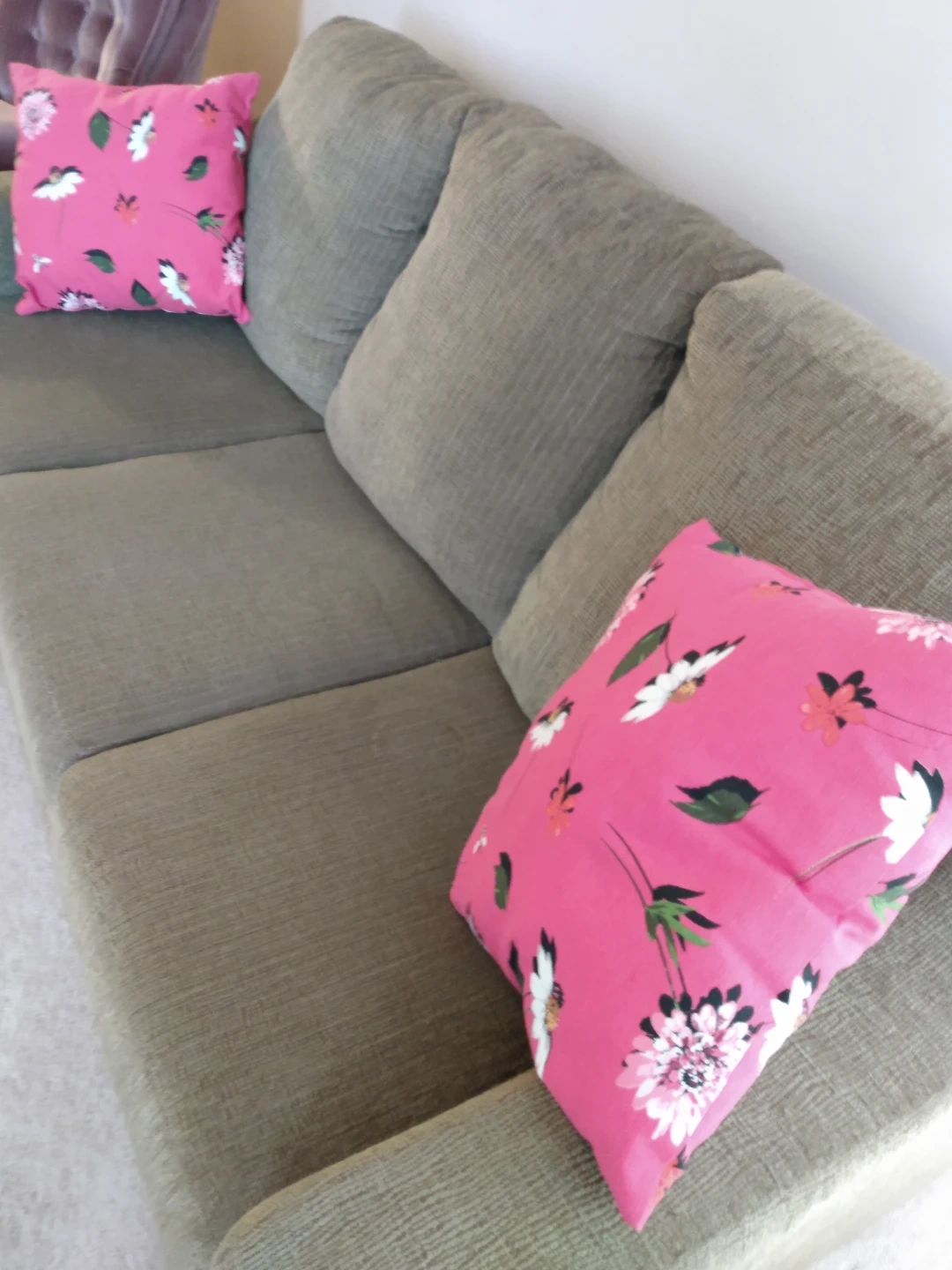 8Comfortable three-seater sofa. Durable fabric upholstery. Olive green colour. Includes two matching pink floral throw pillows. Great for living room.π