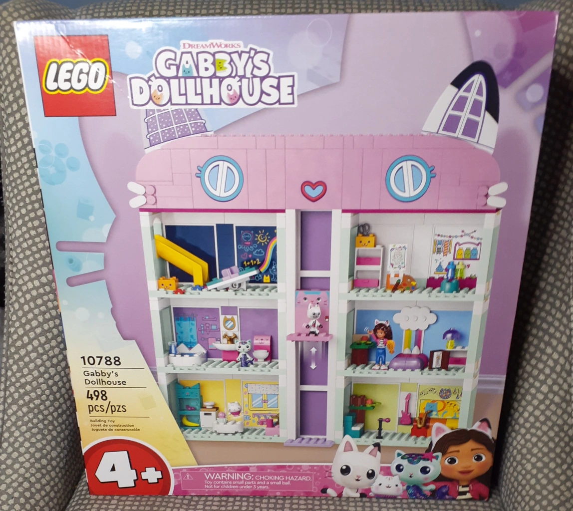 295LEGO Gabby's Dollhouse building set. 498 pieces. Ages 4+. Features a multi-level dollhouse with various rooms and accessories. Includes minifigures.