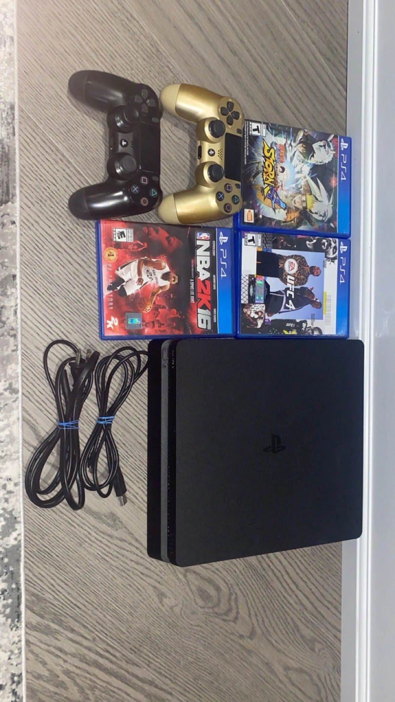 PlayStation 4 Slim console. Includes two controllers, one black and one gold. Four games included: NBA 2K16, Naruto Storm 4, and UFC 4. Also comes with charging and power cable.