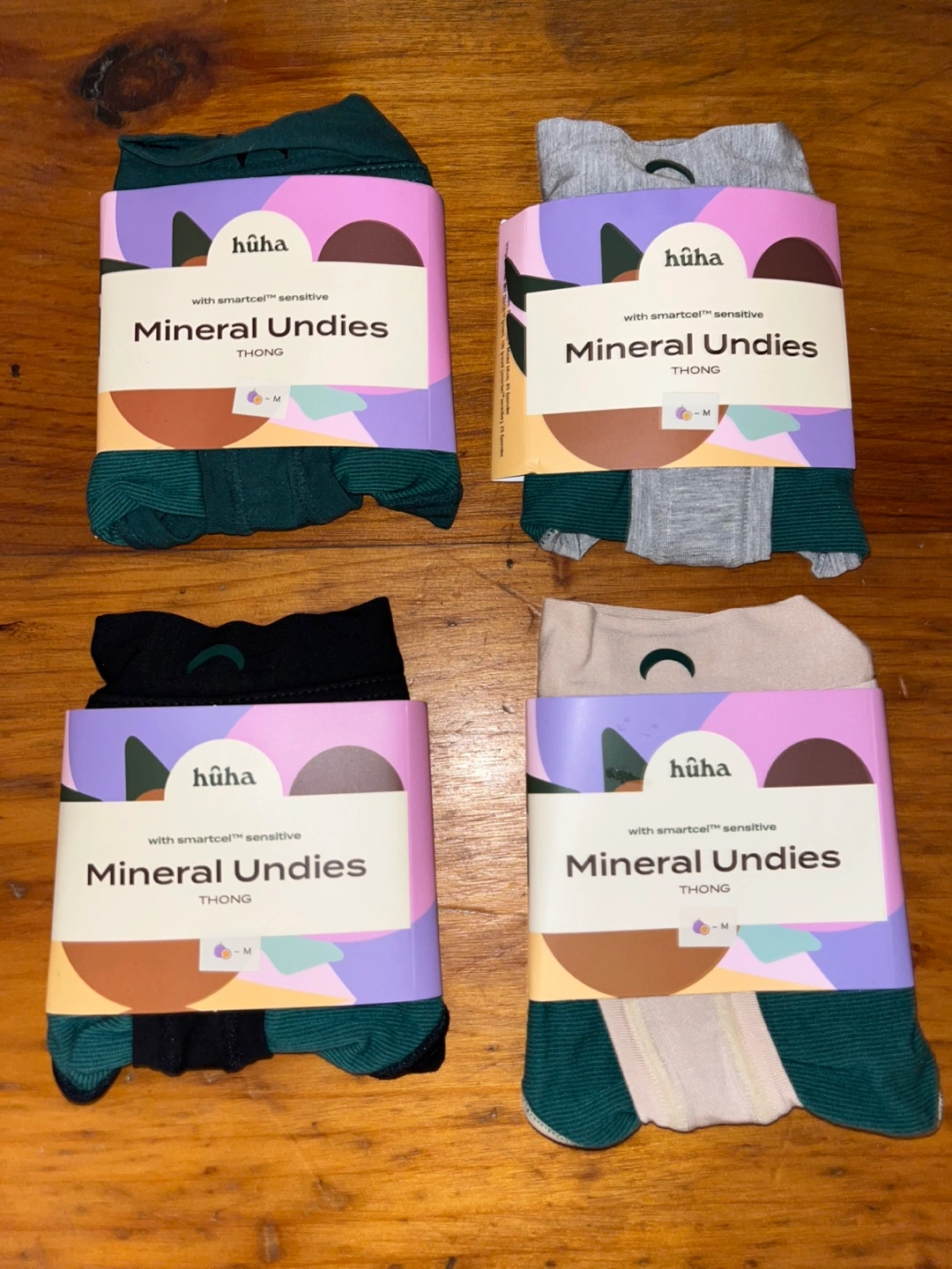 Four pairs of Huha Mineral Undies thongs. Size medium. Grey, dark green, beige and black colours. With smartcell™ sensitive technology. Brand New. Has not been opened.