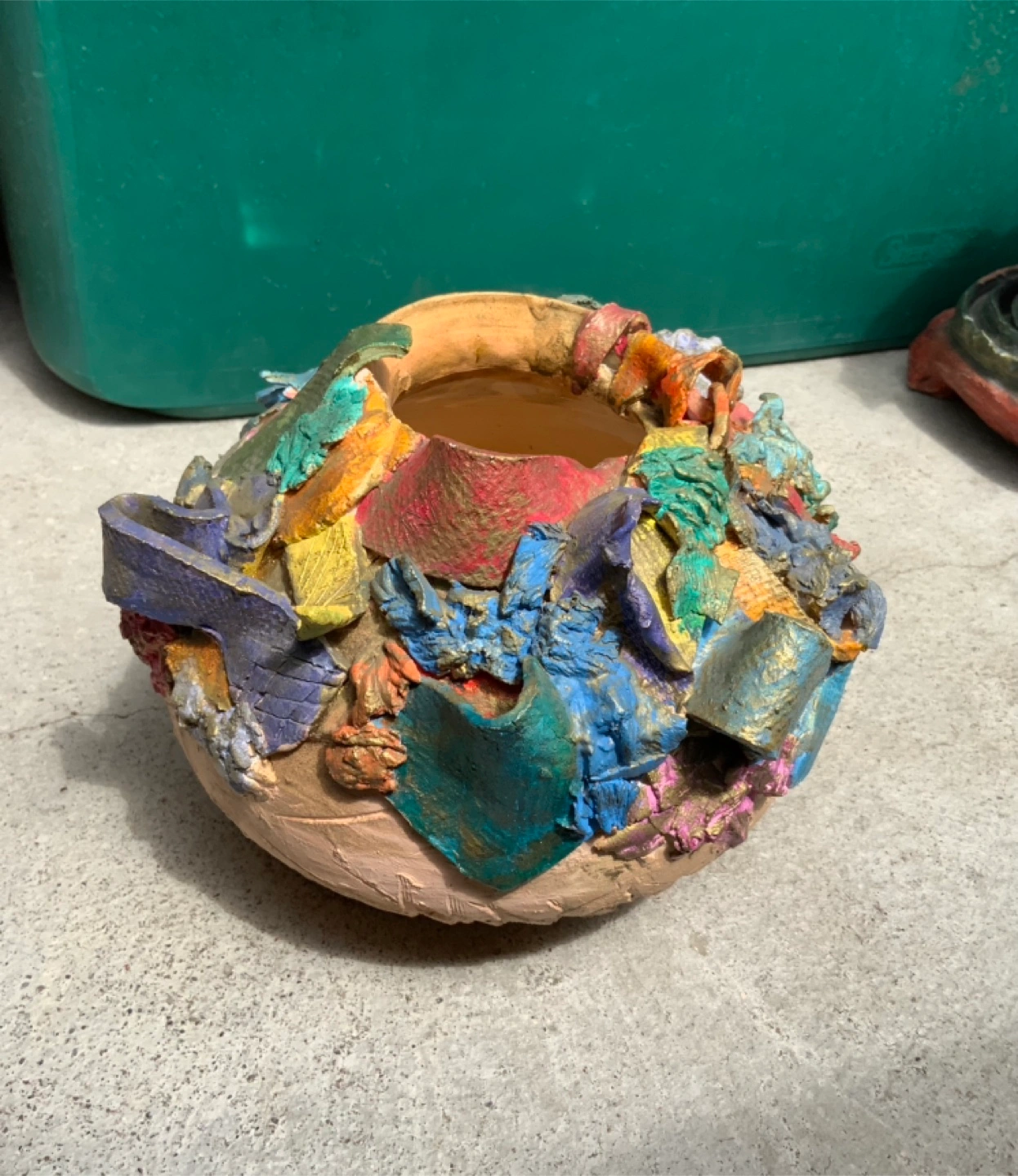 Multicoloured unique ceramic planter. Features various textures and colours. Great addition to any garden décor.