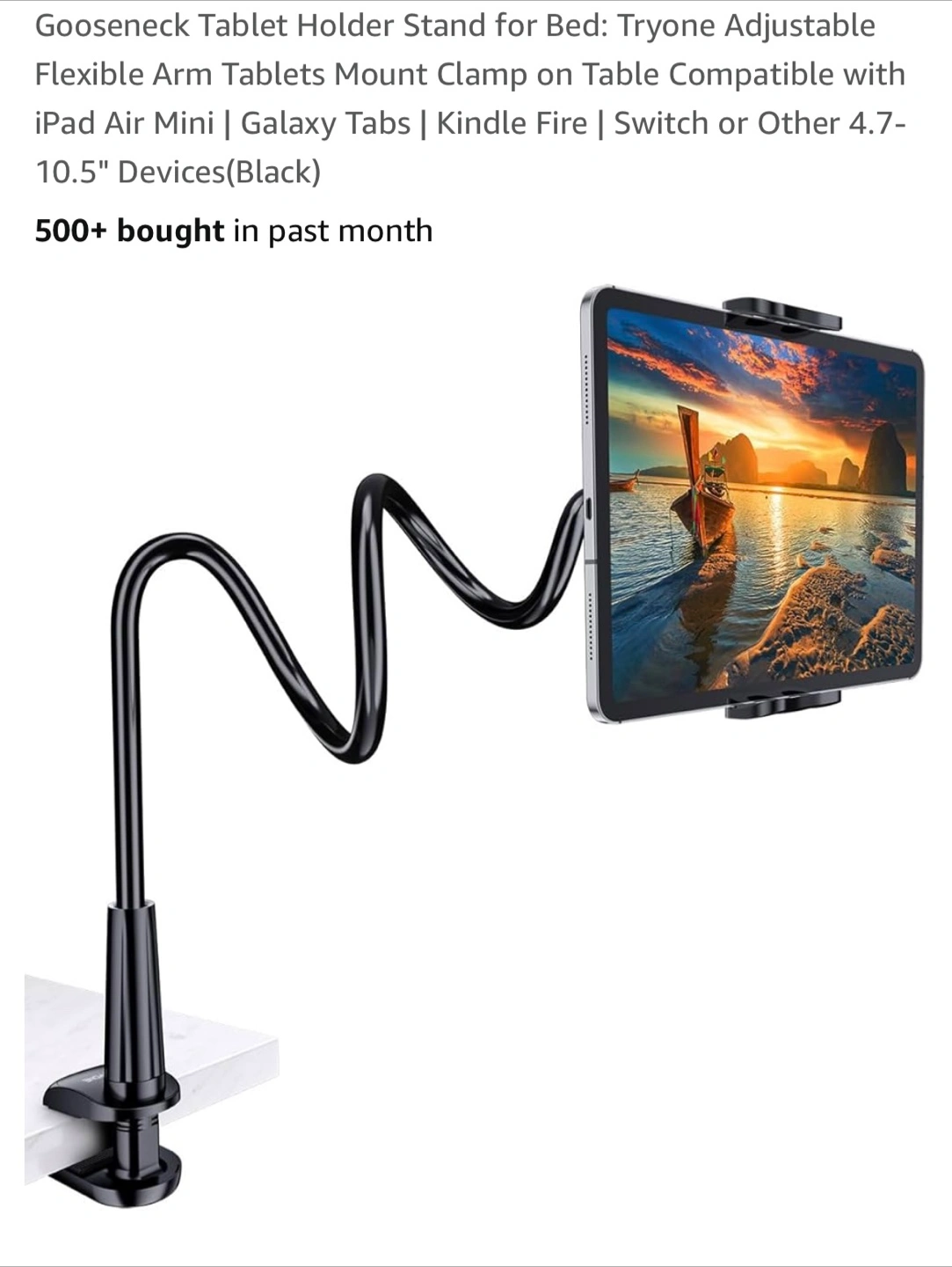 Flexible arm mount. Table clamp. Compatible with iPad Air Mini, Galaxy Tabs, Kindle Fire, Switch, and other 4.7-10.5" devices. Black. Maximize desk space.