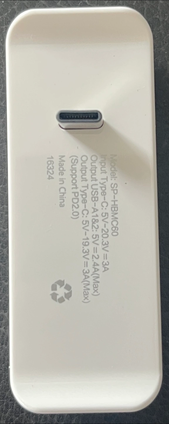Three-port charging hub. Converts Apple power adapter to a 3-port charging hub. Adds two USB-A ports. Compatible with 61W Apple power adapter. Compact and portable design. White.