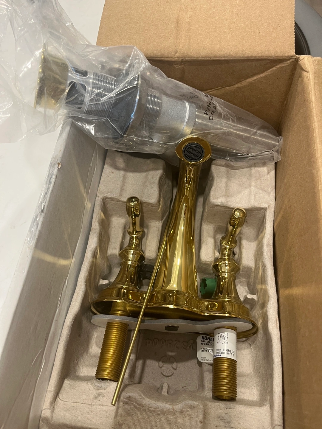 Beautiful gold-coloured bathroom faucet. Two handles. New in box. Includes all parts. Elegant design. Perfect for a classic bathroom.