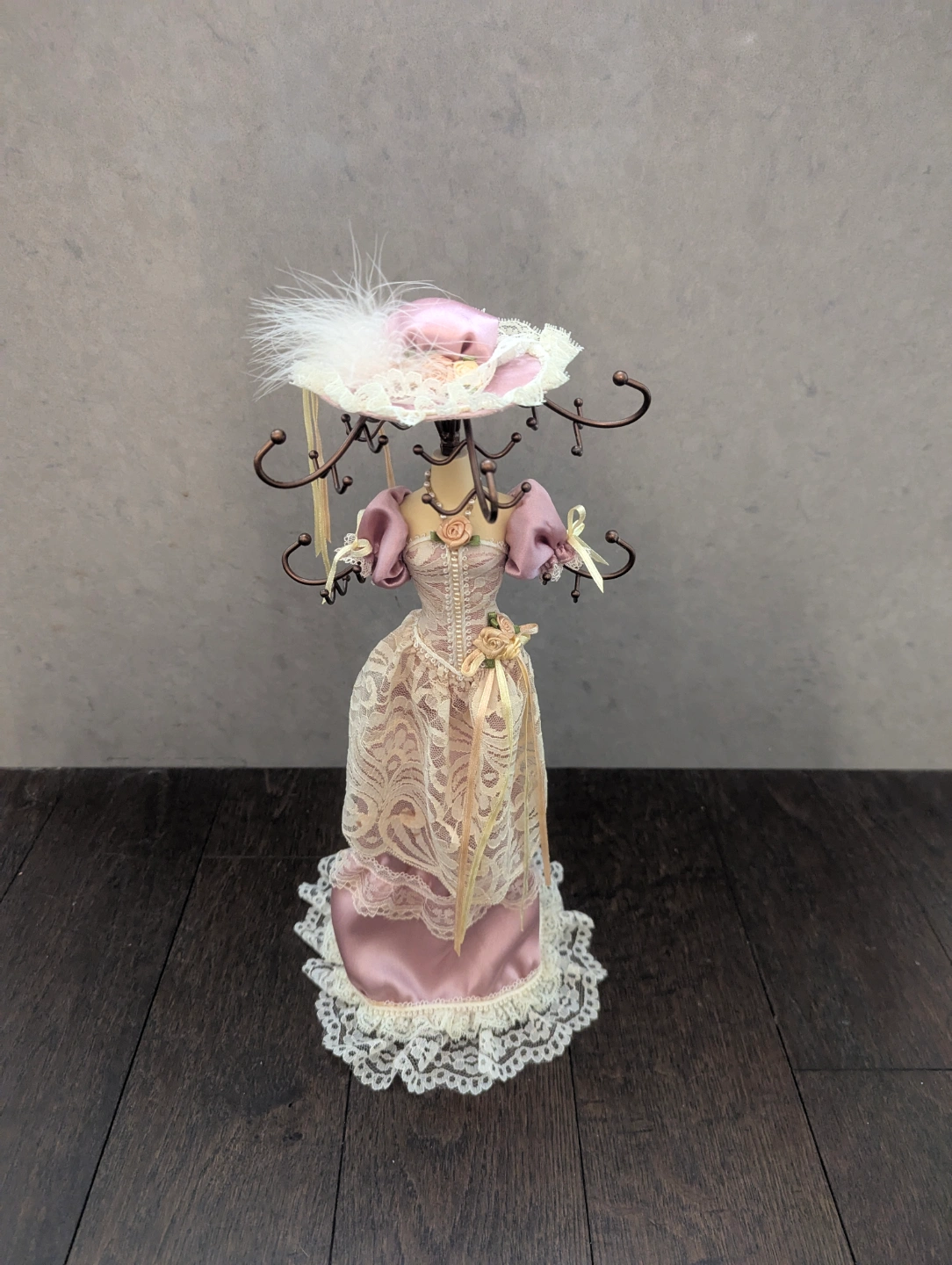 Ornate jewellery stand. Features a lady figurine in a pink lace dress and hat. Multiple hooks for earrings and necklaces. Perfect for organizing jewellery.