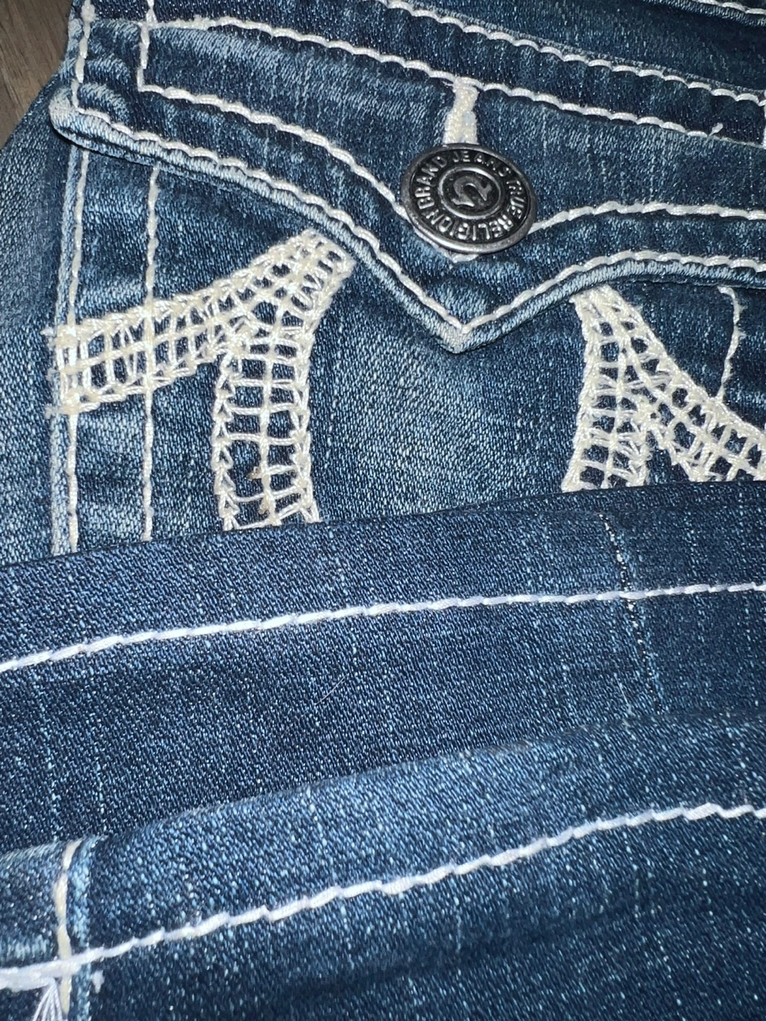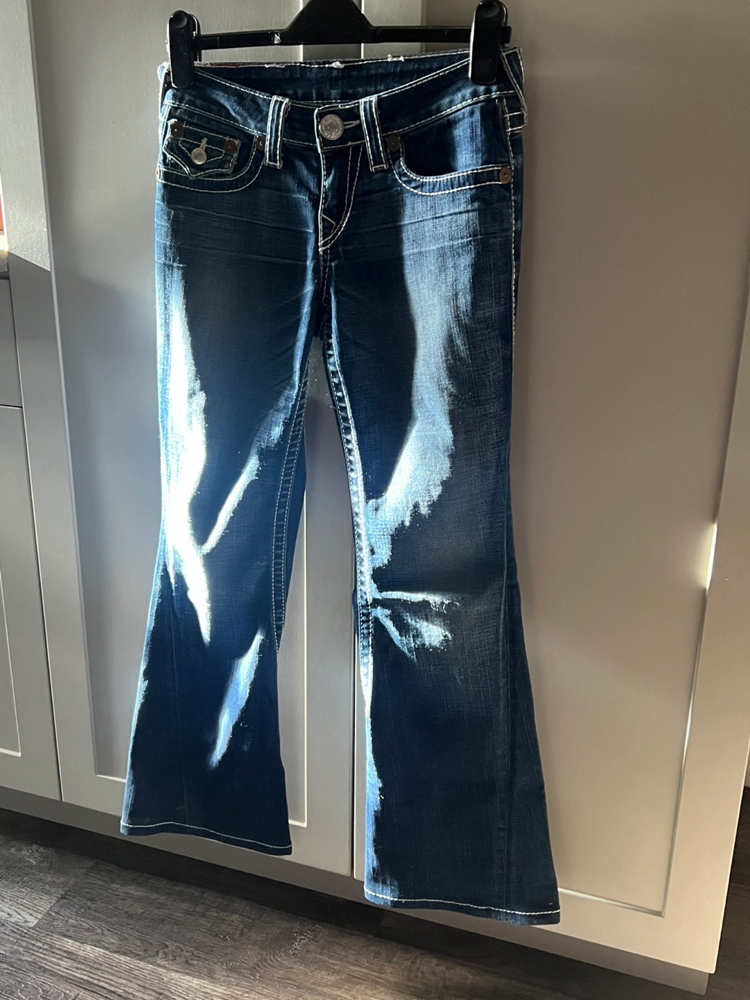 Authentic triple stitch, True Religion®️ Jean, for women. These are as real as they come, purchased from “Pushe”, and had them taken in the waist and length. The size now is marked below: if you compare the stitching in photos, you can see they were hemmed and taken in, but a beautiful pair of jeans still- just don’t fit me well anymore.