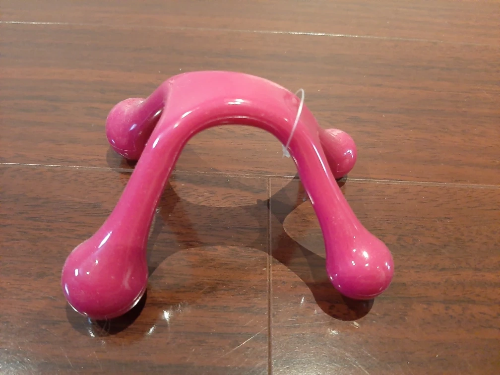Compact and portable muscle massager. Perfect for targeting knots and tension. Ergonomic design. Dark pink colour.