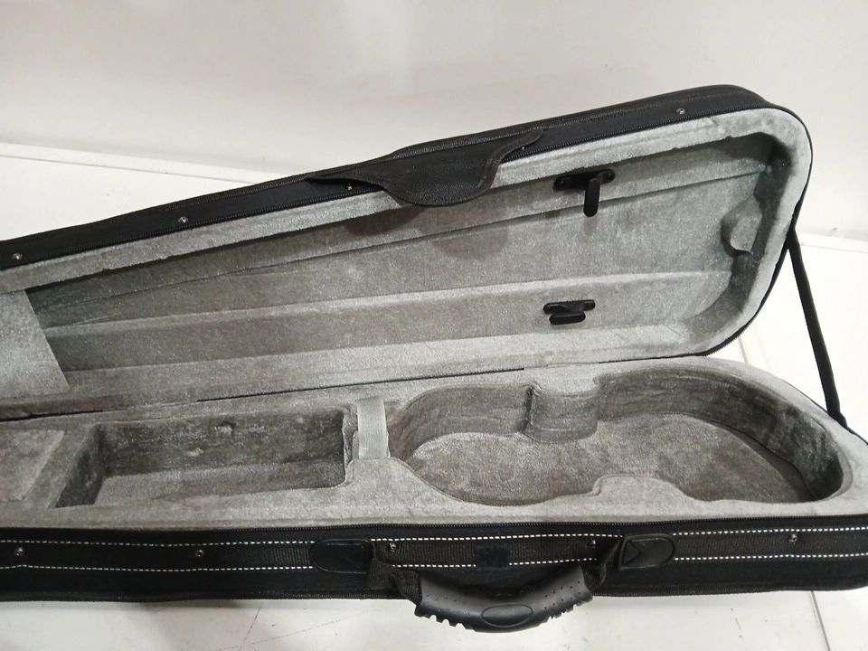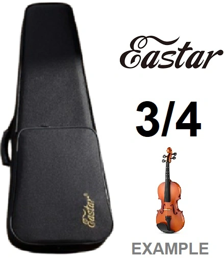 This is an Eastar 3/4 size violin case, perfect for protecting your instrument with its soft shell and convenient front pocket zipper. The case is in used condition but still offers great protection and storage for your violin.